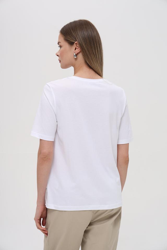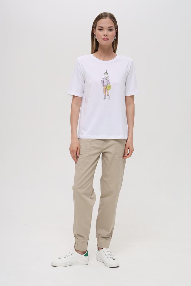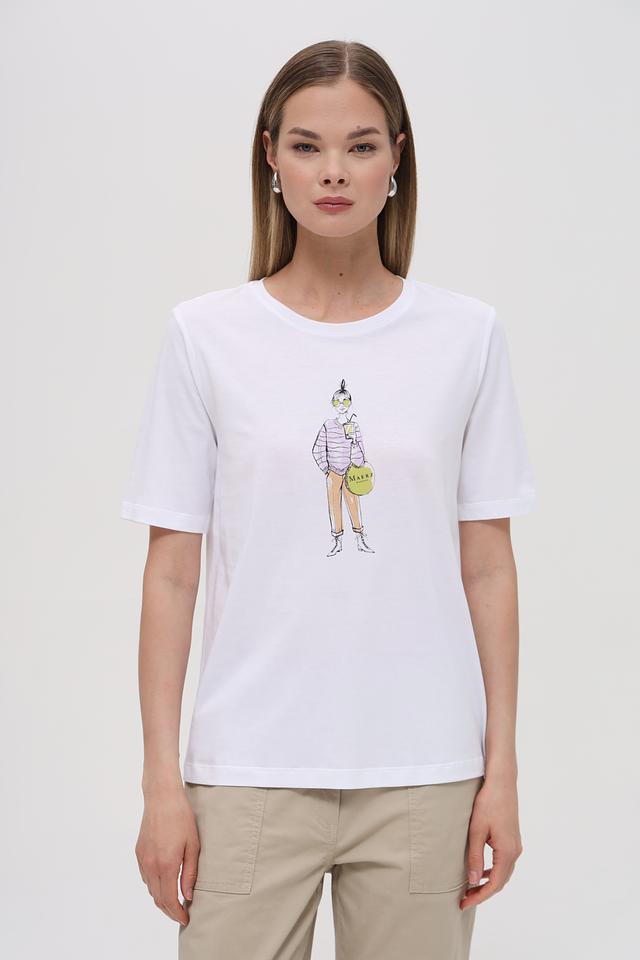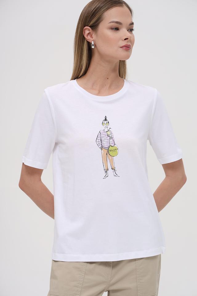 Белая футболка от Maerz с оригинальным принтом в виде стилизованного изображения девушки. Изготовлена из мягкого и приятного к телу сочетания хлопка и модала, обеспечивающего комфорт в носке. Состав: хлопок 50%, модал 50%