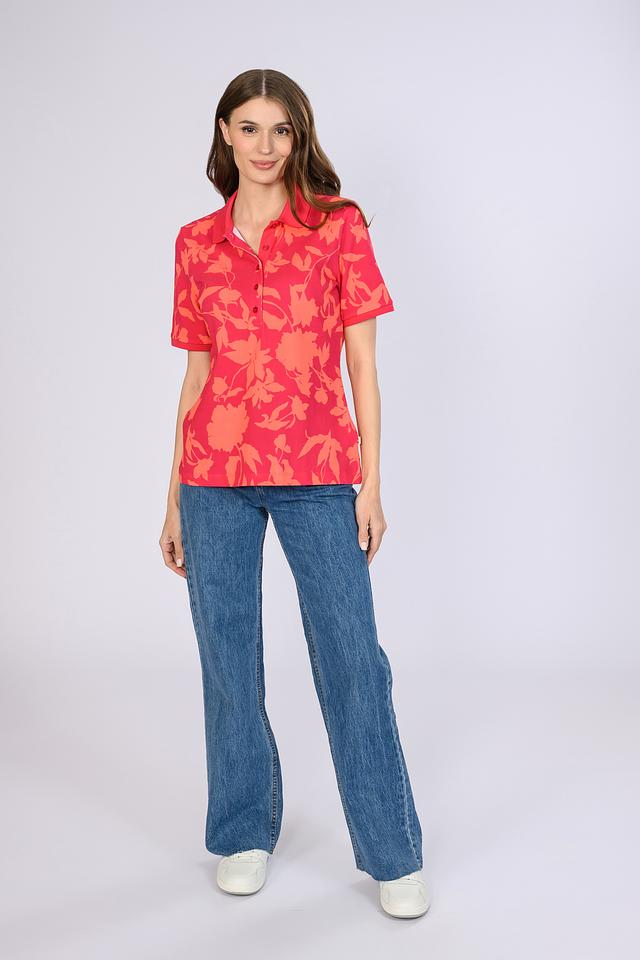 Женская поло Maerz кораллового цвета, декорирована цветочным принтом. Изготовлена из натурального хлопка, обеспечивающего комфорт и воздухопроницаемость. Классический крой и аккуратный воротник-поло делают эту модель универсальной для создания повседневных образов. Состав: хлопок 100%