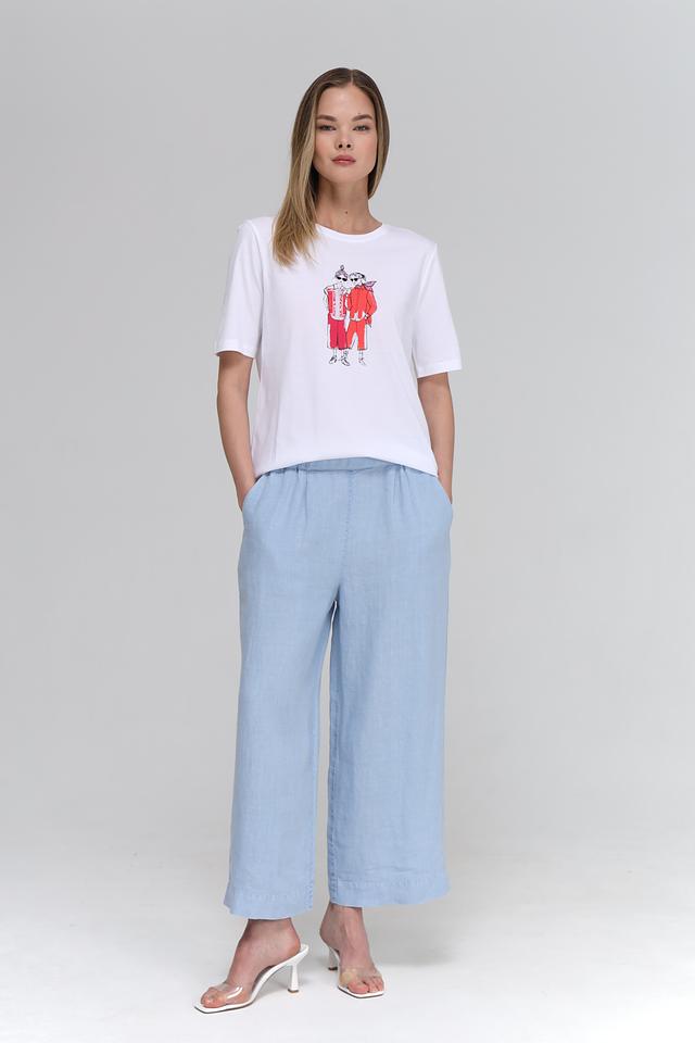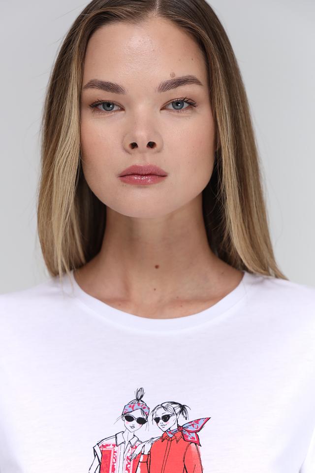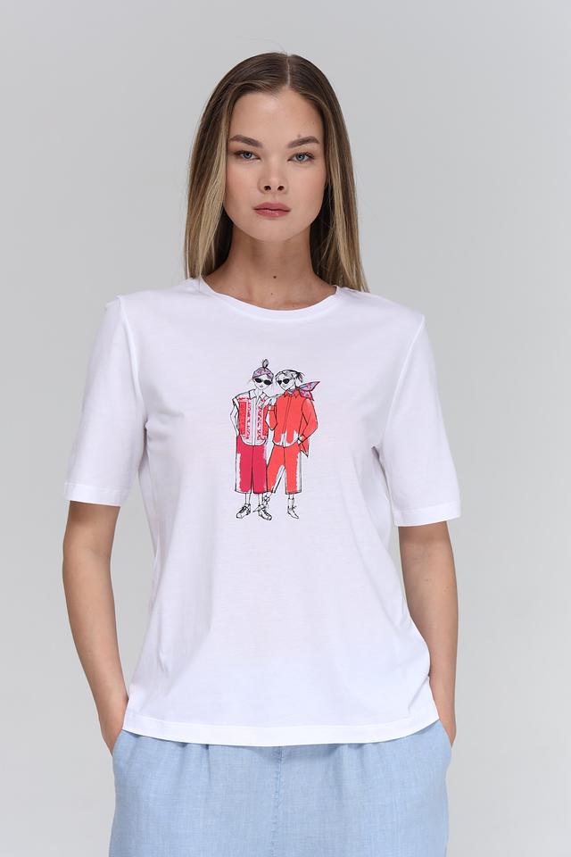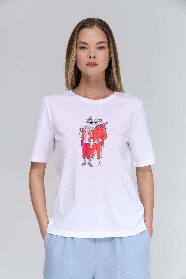 Особенностью данной модели является оригинальный принт с изображением двух стилизованных фигур в красных костюмах. Этот яркий акцент придаёт футболке индивидуальность и делает её отличным выбором для создания повседневных образов.