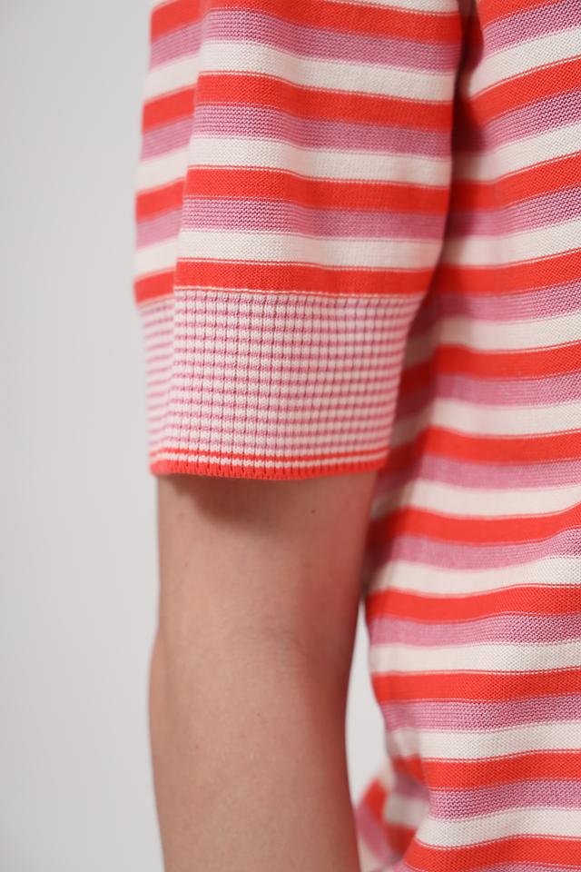 Этот стильный пуловер от бренда Maerz выполнен в актуальной полосатой расцветке. Преобладающий коралловый цвет гармонично сочетается с белыми полосами, создавая свежий и летний образ.