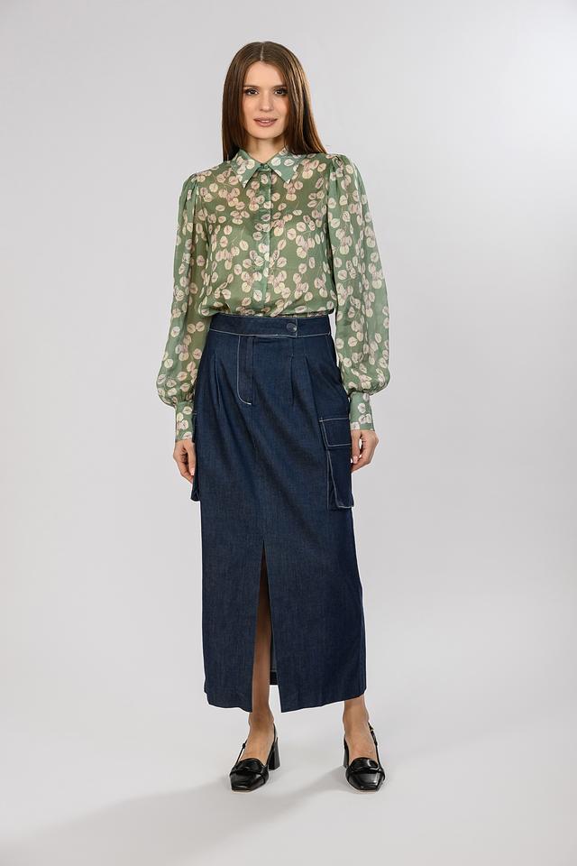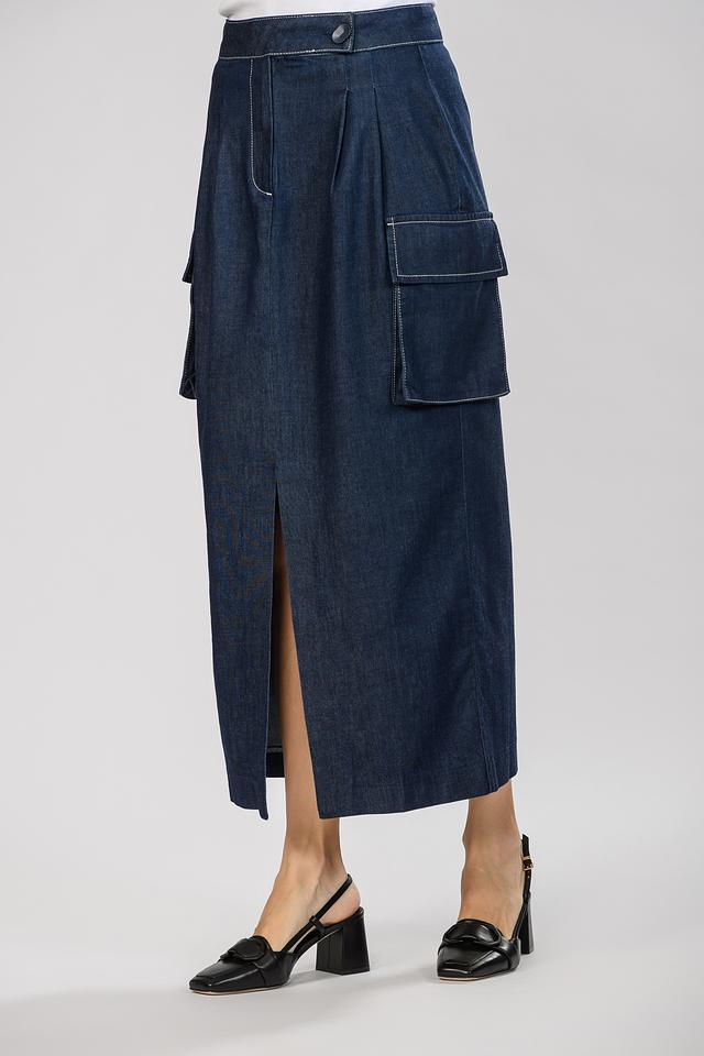 Юбка имеет длину миди и прямой крой, обеспечивающий комфортную посадку по фигуре. На передней части юбки расположен накладной карман, который добавляет функциональности и стиля. Боковой разрез придает образу легкость и динамичность.