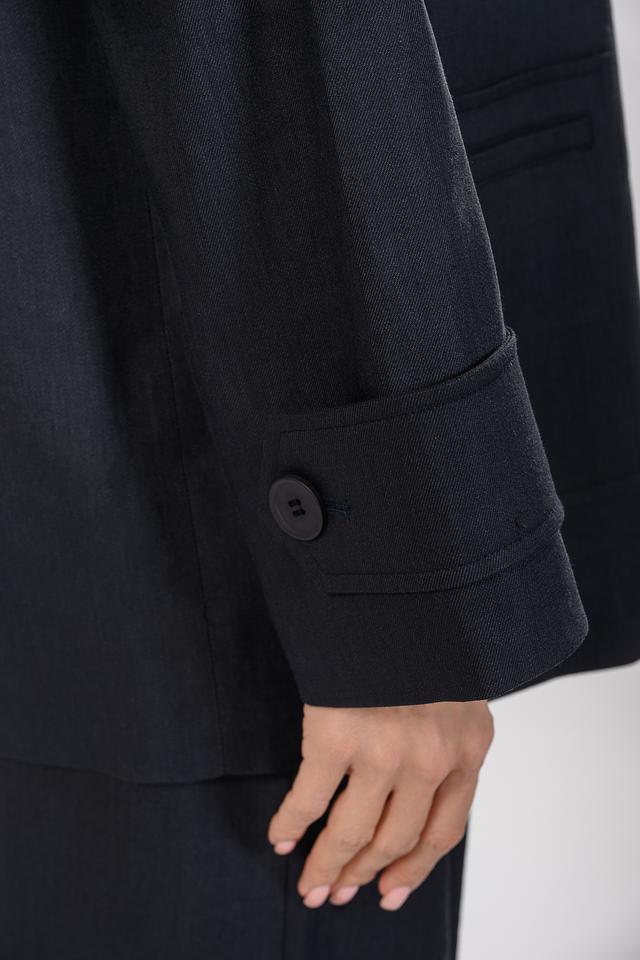 Жакет имеет прямой крой, который обеспечивает комфортную посадку по фигуре. Застежка на пуговицы, лацканы классической формы и накладные карманы придают ему завершенный вид. Рукава жакета имеют длину 3/4 и дополнены манжетами.