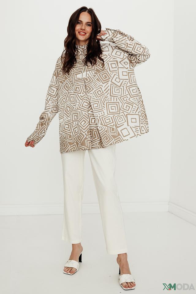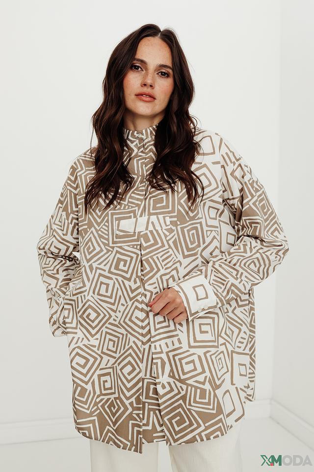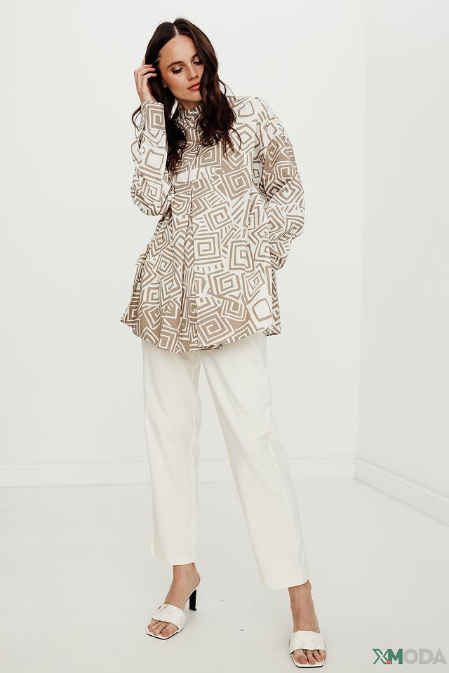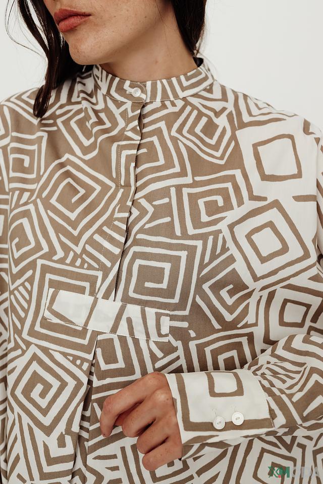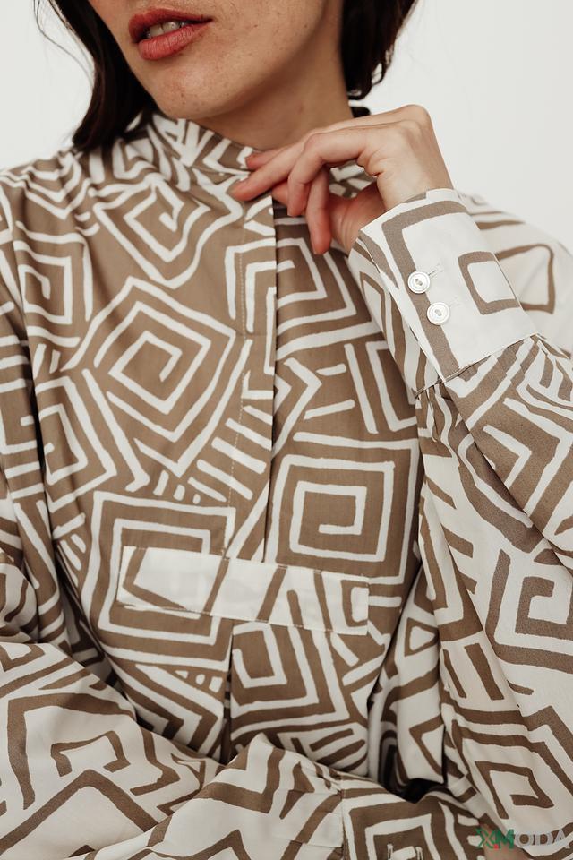 Модель имеет свободный крой, который обеспечивает комфорт и свободу движений. Платье застегивается на ряд пуговиц, что позволяет регулировать степень открытия. Длинные рукава и воротник-стойка добавляют изысканности.