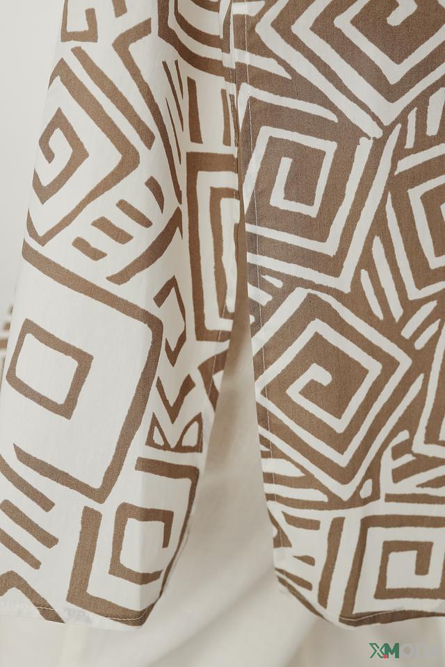 Это платье от Manila Grace – отличный выбор для создания непринужденного, но элегантного образа. Платье выполнено в бежевой цветовой гамме и украшено выразительным геометрическим принтом, состоящим из белых и коричневых линий.