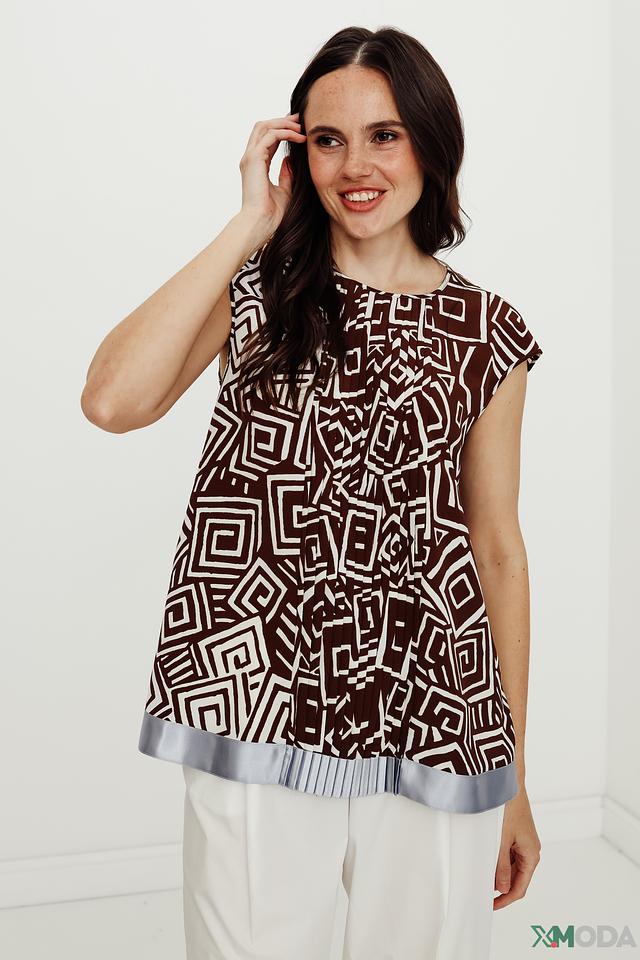 Блуза Manila Grace коричневого цвета с оригинальным геометрическим принтом станет стильным дополнением вашего гардероба. Модель без рукавов с округлым вырезом и плиссировкой на горловине выполнена из легкой ткани на основе полиэстера. Состав: полиэстер 100%