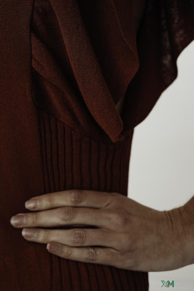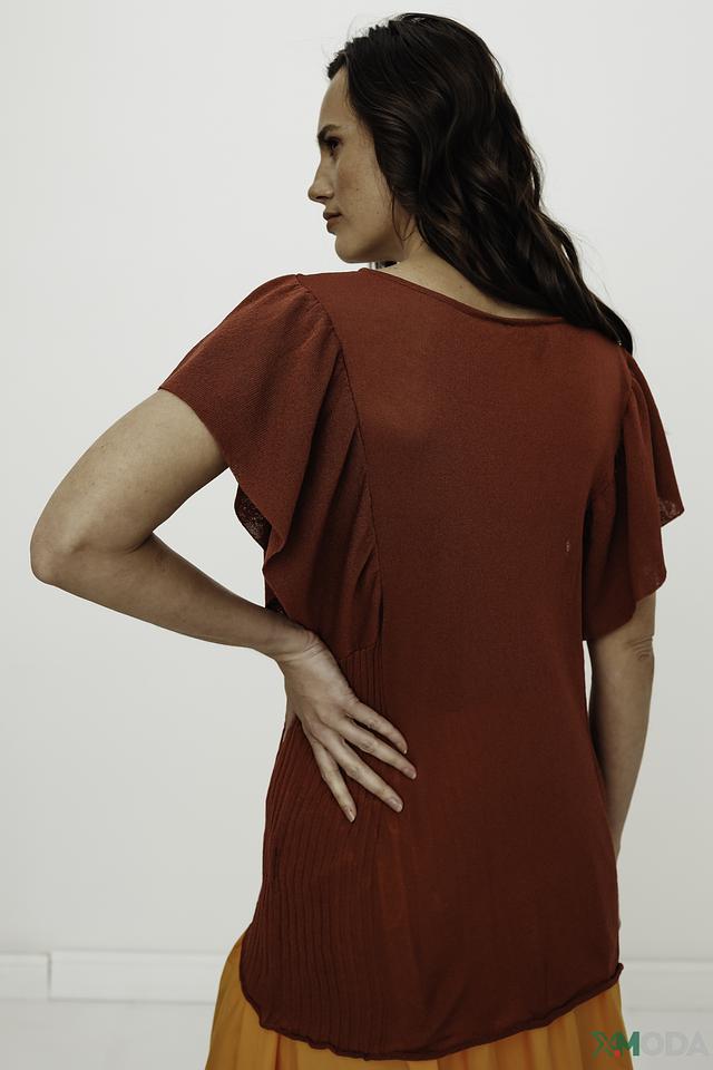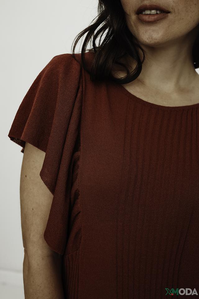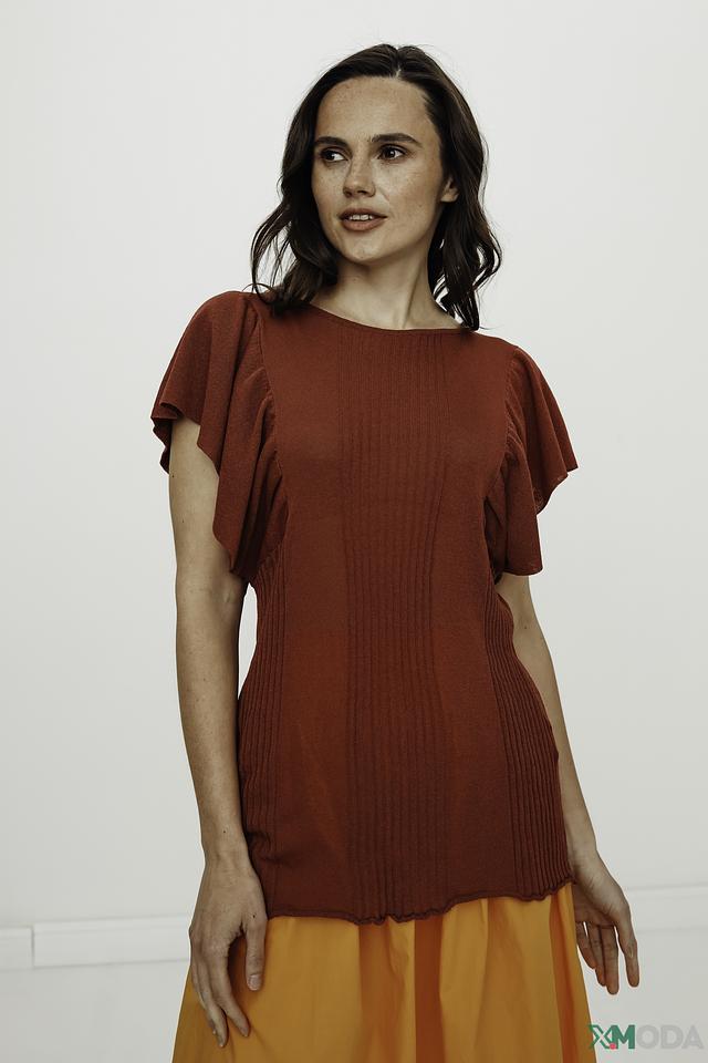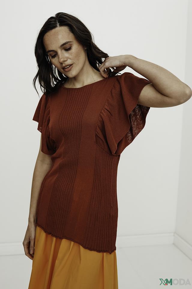 Джемпер имеет терракотовый цвет, который подчеркнет вашу индивидуальность и добавит образу теплоты. Оригинальный дизайн с воланами на рукавах и декоративной сборкой на талии делает его особенным и привлекательным.