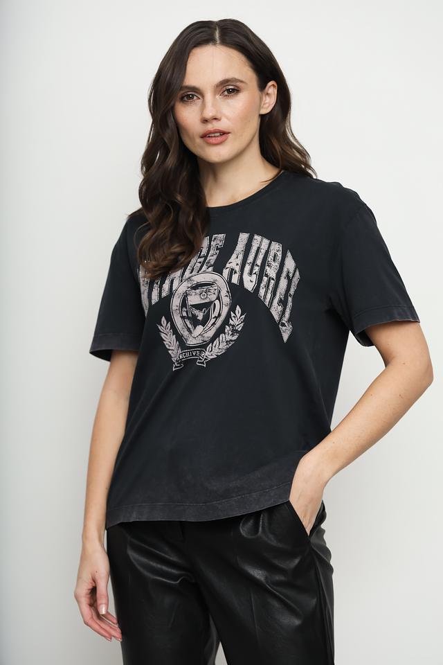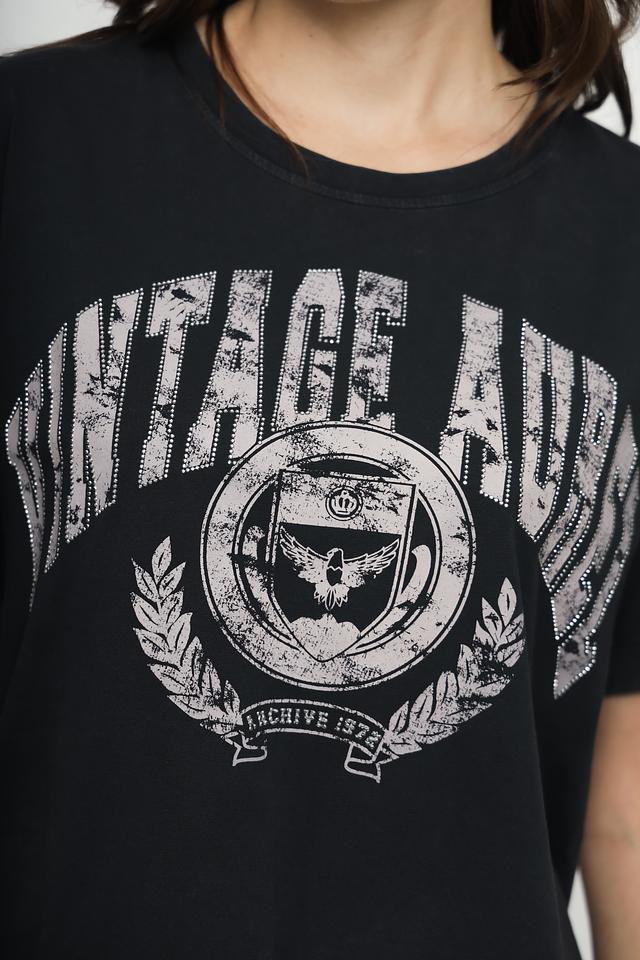 Особенностью данной модели является крупный винтажный принт в серо-белой гамме, который придает футболке индивидуальность и выразительность. Принт выполнен в стиле гранж, с эффектом потертости, что добавляет ей аутентичности.