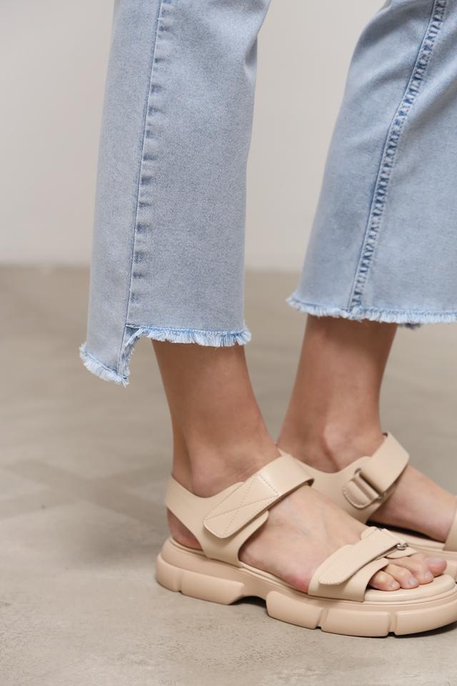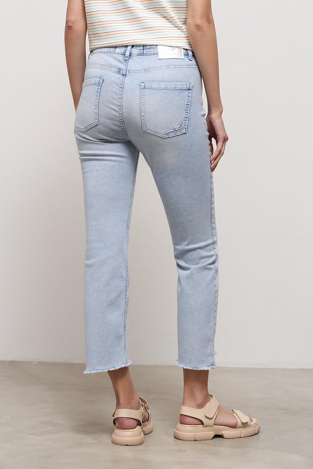 Джинсы имеют высокую посадку, которая подчеркивает талию и визуально удлиняет ноги. Прямой, слегка укороченный крой создает современный силуэт и позволяет сочетать джинсы с различной обувью – от кед до ботильонов.