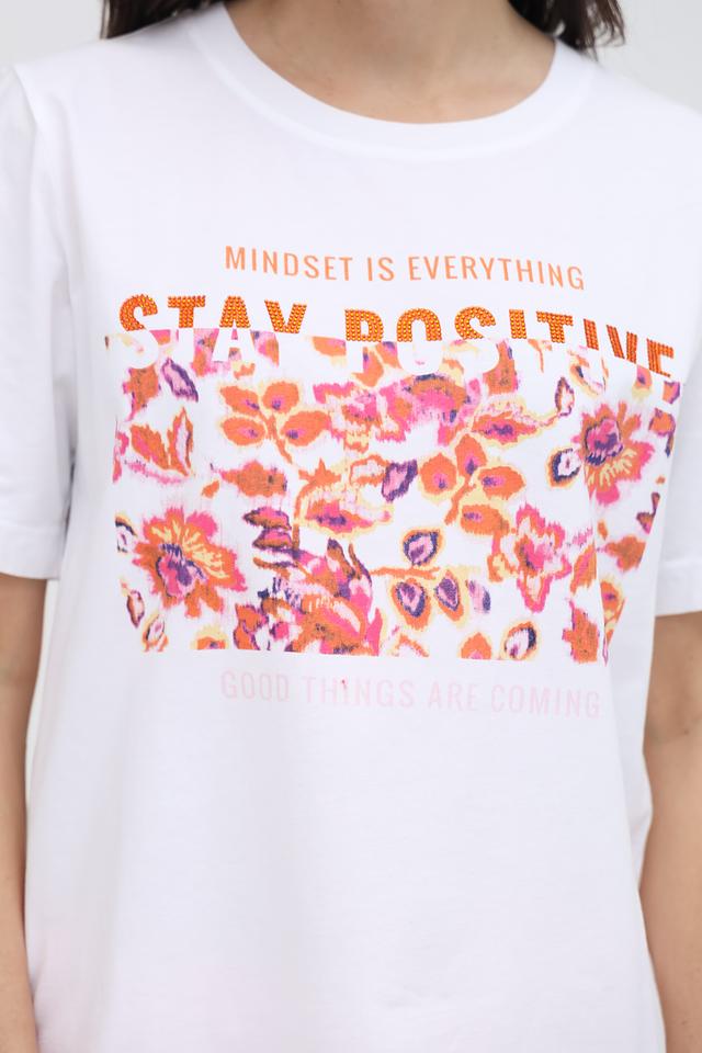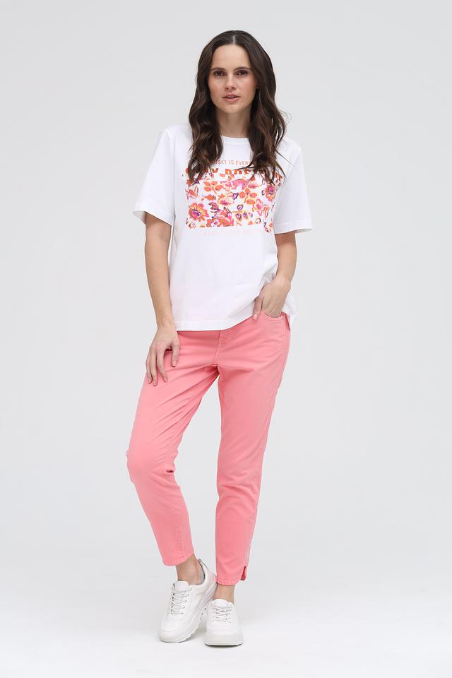 Основной цвет футболки – белый, который служит идеальным фоном для яркого цветочного принта. Принт выполнен в насыщенных оттенках розового, оранжевого и фиолетового, создавая жизнерадостный и привлекательный образ.