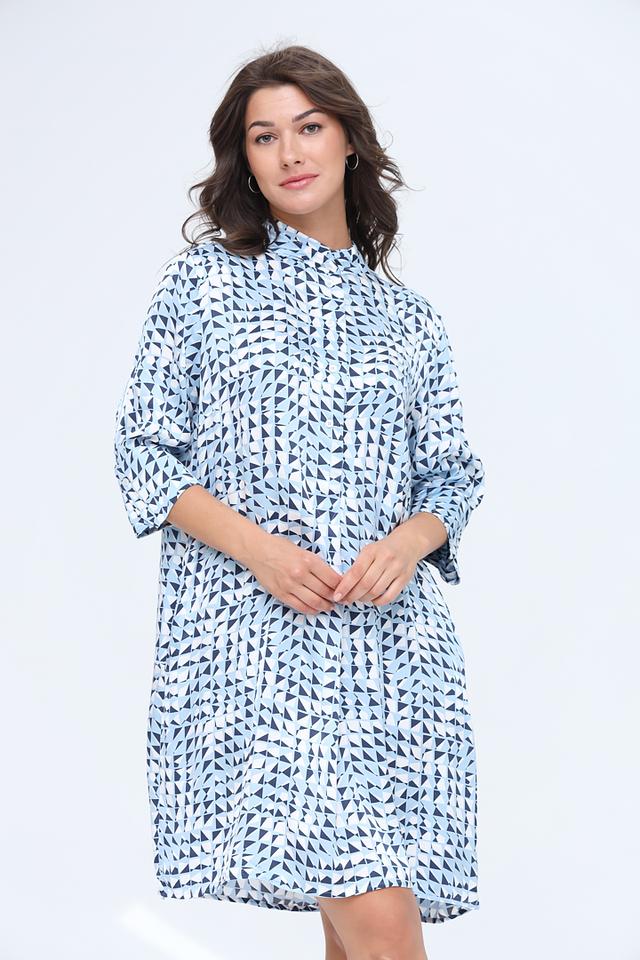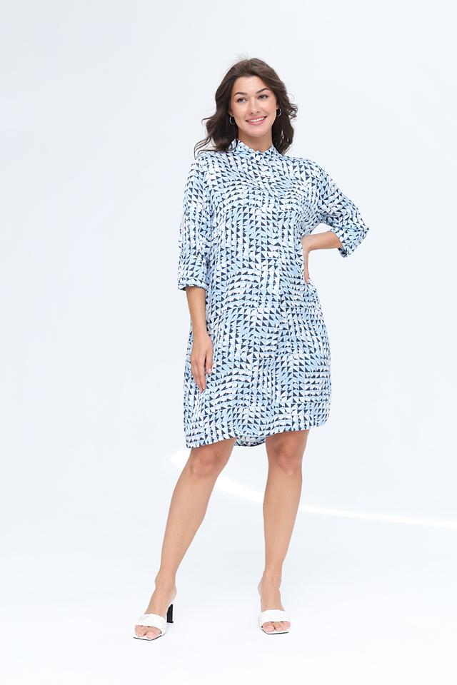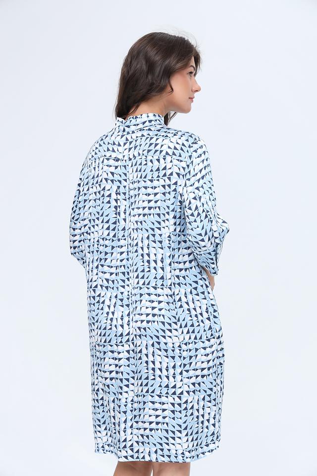 Дизайн платья представлен в виде геометрического принта, сочетающего в себе оттенки голубого и синего. У платья воротник-стойка и рукава три четверти. Свободный крой не сковывает движений и позволяет создать непринужденный образ.