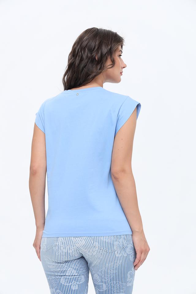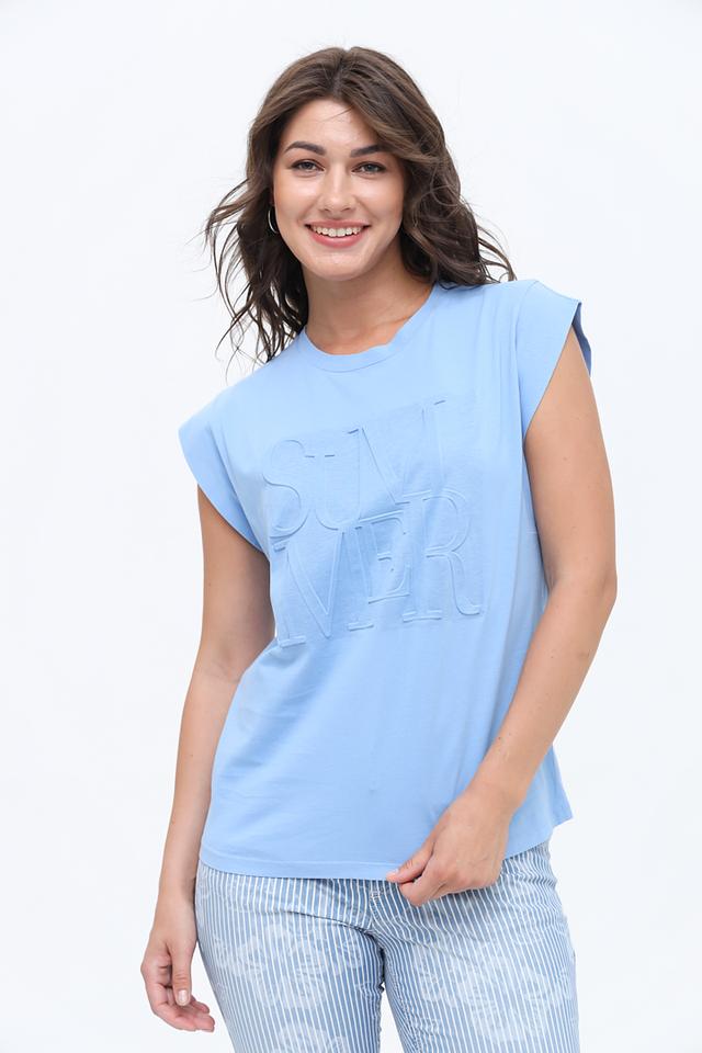 Футболка имеет круглый вырез горловины и короткие рукава с широкими манжетами. Благодаря своему лаконичному дизайну и приятному голубому оттенку, эта футболка станет универсальным дополнением к вашему гардеробу. Она легко сочетается с джинсами, шортами, юбками и другими элементами одежды.