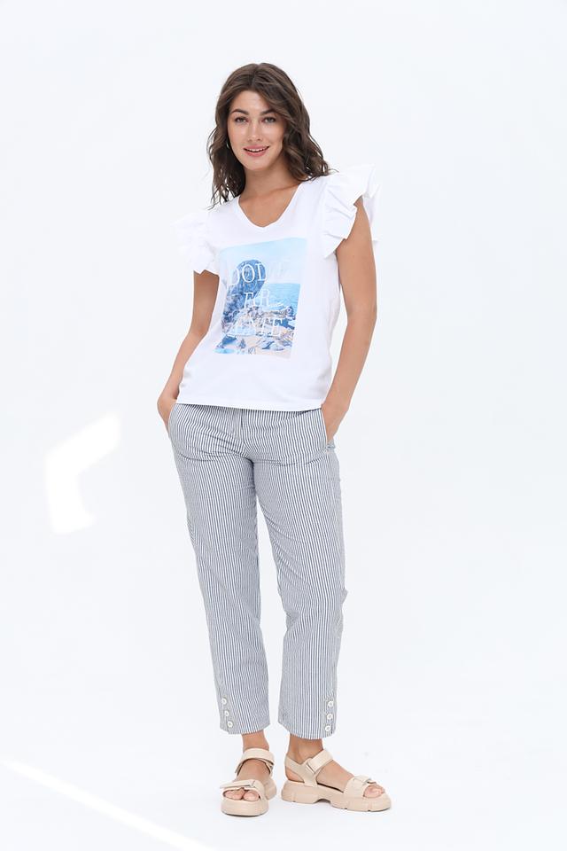 Особенностью данной модели является яркий принт с изображением архитектуры, который добавляет ей оригинальности и стиля. Воланы на рукавах придают футболке женственности и легкости.