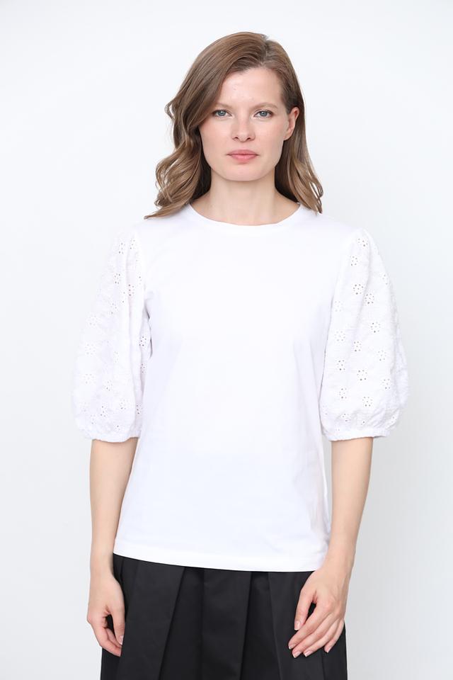 Белая блуза Marc Aurel из 100% хлопка с объёмными рукавами, выполненными в технике перфорации. Лёгкая и воздушная модель станет отличным дополнением к летнему гардеробу. Состав: хлопок 100%