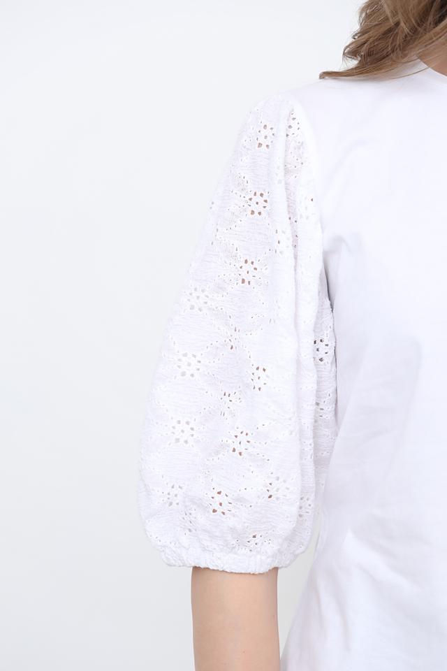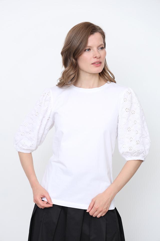 Модель имеет прямой крой и круглый вырез горловины. Особое внимание привлекают объёмные рукава, выполненные в технике перфорации – это придает блузе лёгкость и оригинальность.