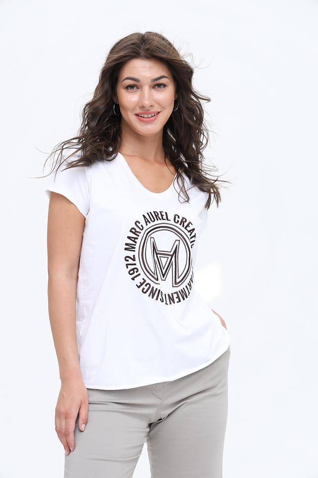 Футболка имеет классический V-образный вырез и короткие рукава, что делает ее универсальной для различных образов. На передней части футболки расположен круглый принт с логотипом бренда и надписью "MARC AUREL CREATIVE".