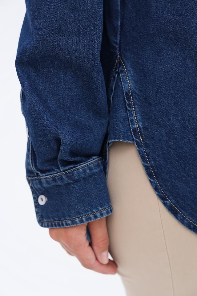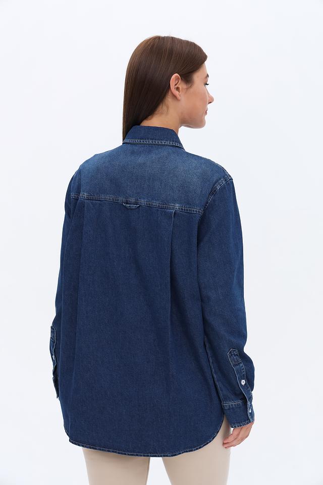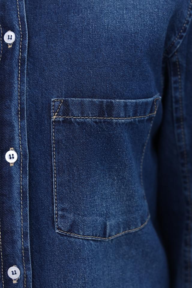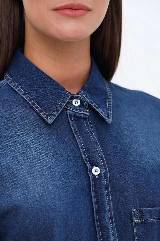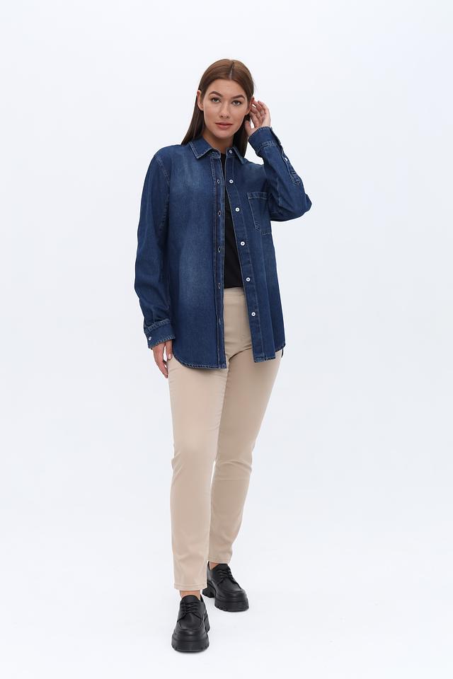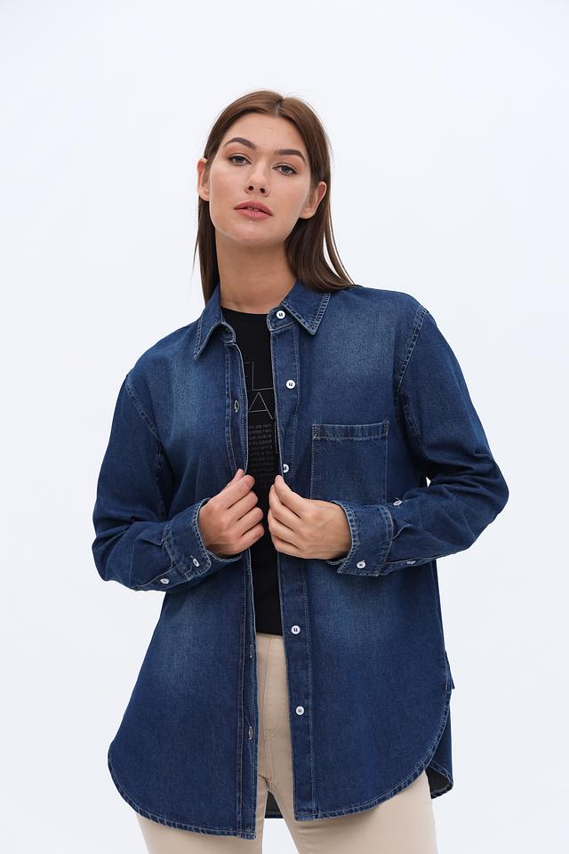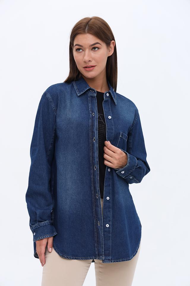 Рубашка имеет классический крой с длинными рукавами и традиционной застежкой на пуговицы. На груди расположен накладной карман, добавляющий функциональности и стиля. Оттенок рубашки – насыщенный синий, имитирующий цвет денима.