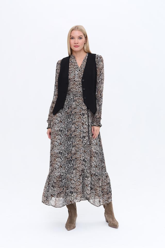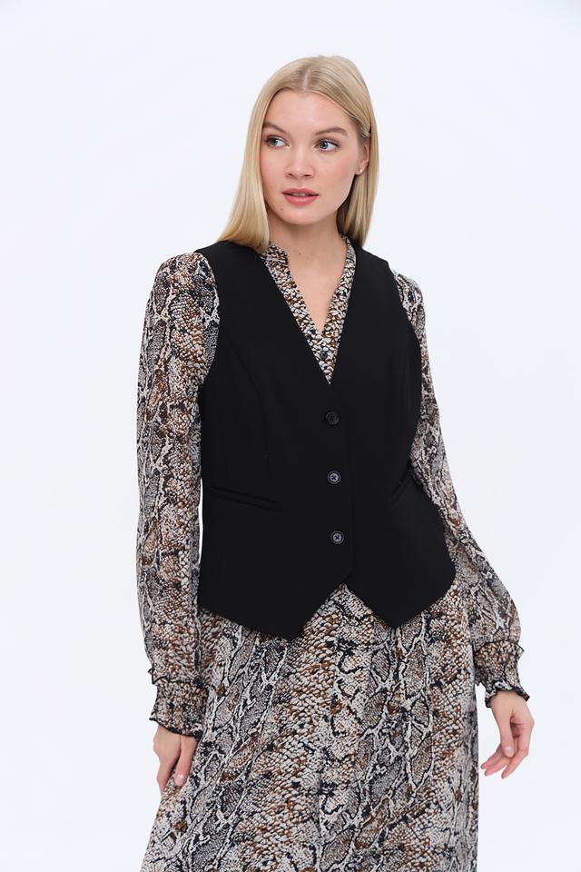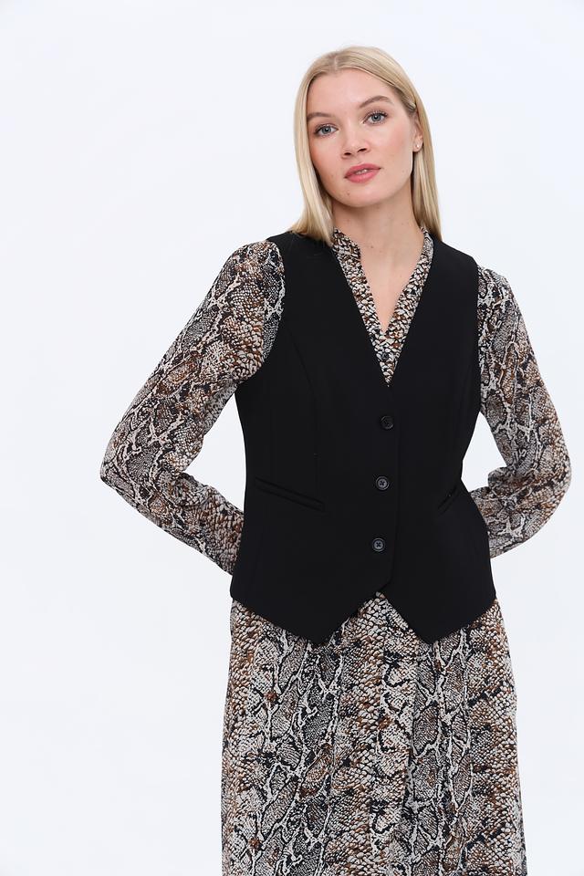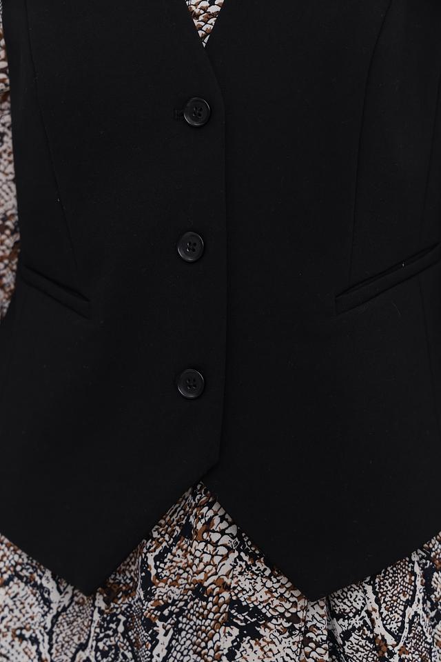Жилет имеет приталенный силуэт, который подчеркивает фигуру. Застёжка на три пуговицы добавляет ему классический вид. Изготовленный из смеси полиамида (51%), вискозы (40%) и эластана (9%), жилет обеспечивает комфорт и удобство в носке, а также хорошо держит форму.