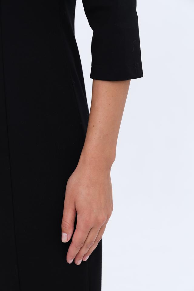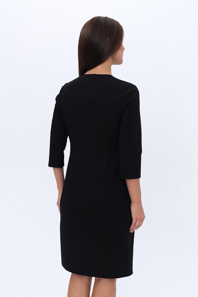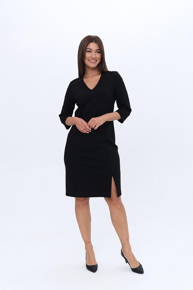 V-образный вырез горловины визуально удлиняет шею и делает образ более женственным. Рукава длиной 3/4 добавляют платью элегантности. Сзади платье имеет небольшой разрез, который придает ему динамичность и кокетливость.