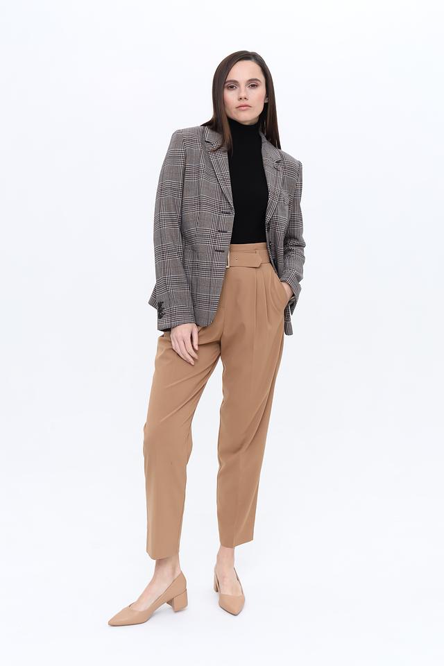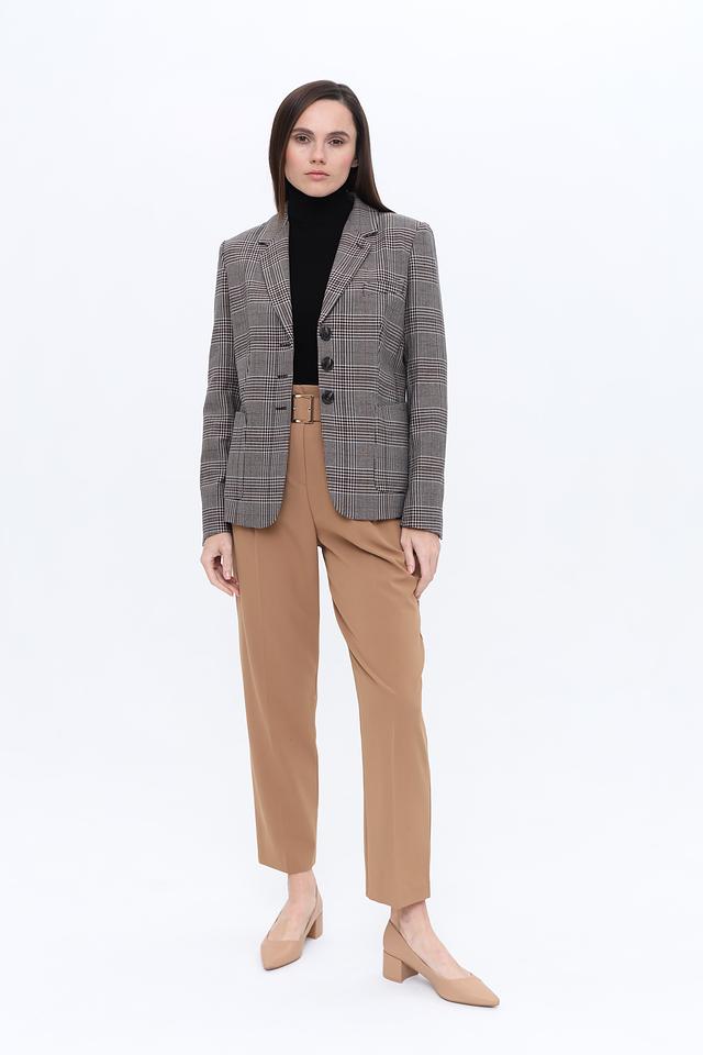 Жакет имеет прямой крой, который обеспечивает комфортную посадку по фигуре. Застежка на три пуговицы позволяет регулировать степень прилегания. Воротник пиджачного типа добавляет образу строгости и элегантности.