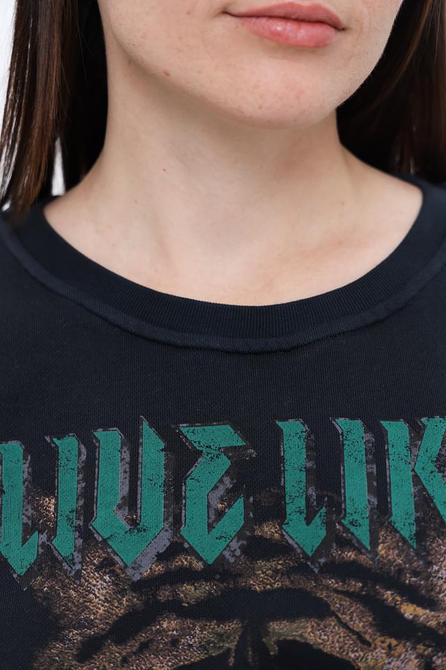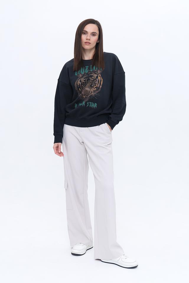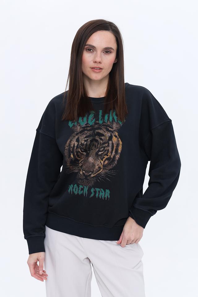 Пуловер украшен эффектным принтом с изображением тигра и надписью, выполненными в зелёных тонах. Принт придает изделию оригинальность и динамичный вид. Классический крой с круглым вырезом горловины и манжетами на рукавах делает этот пуловер универсальным и подходящим для различных стилей.