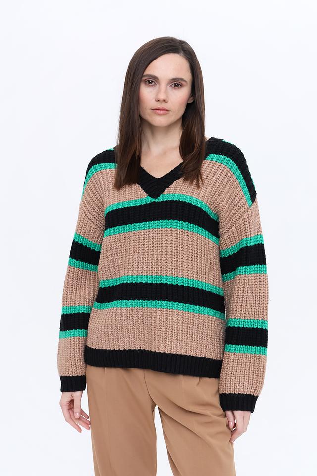 Этот пуловер от Marc Aurel станет отличным дополнением к вашему образу. Он выполнен в бежевом цвете с контрастными полосками чёрного и зелёного оттенков, создавая яркий и запоминающийся вид.