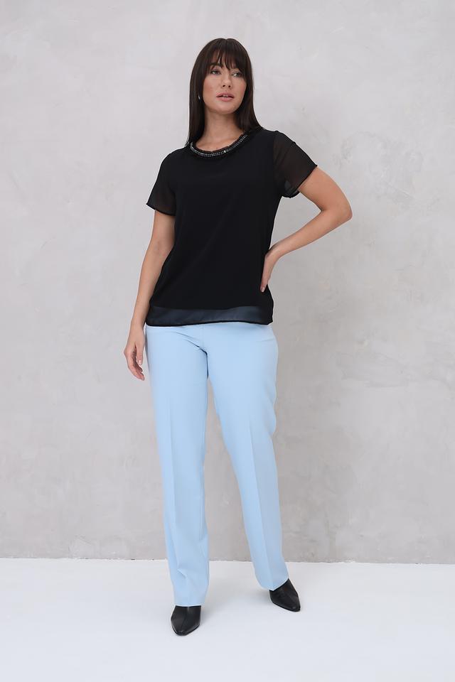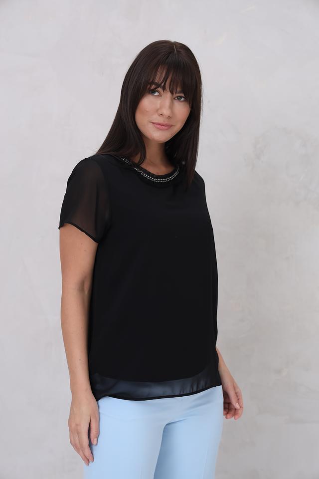 Блуза имеет свободный крой, который обеспечивает комфорт в носке. Короткие рукава выполнены из полупрозрачной ткани, что добавляет модели лёгкости и воздушности. Особое внимание привлекает декоративная отделка горловины – изящная вышивка, выполненная в тон изделия.