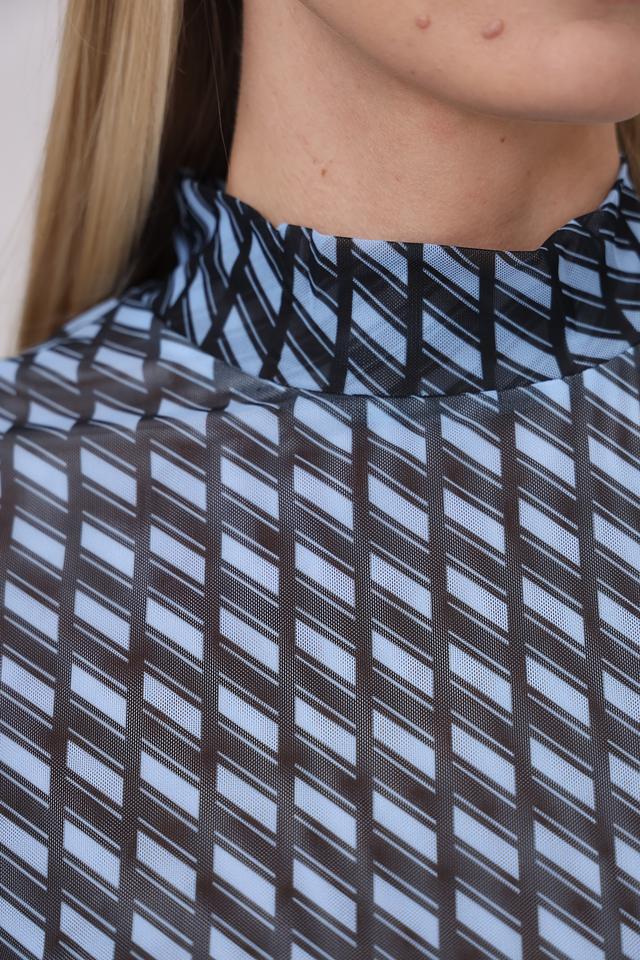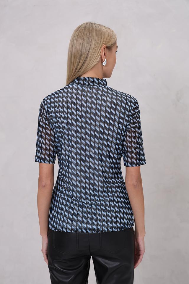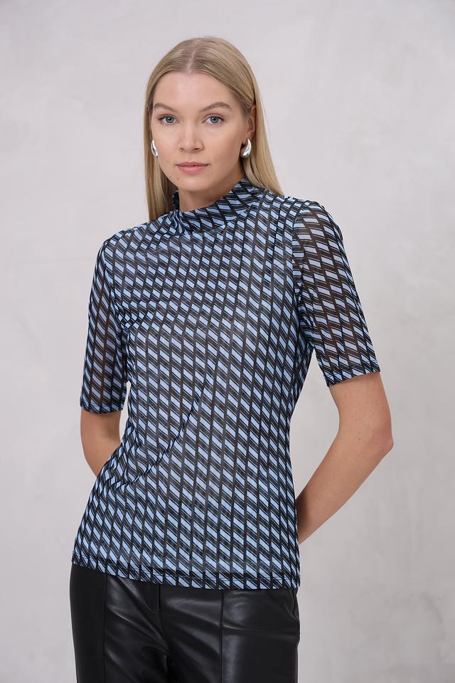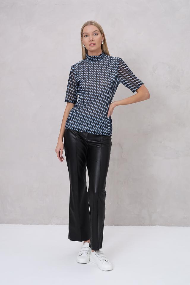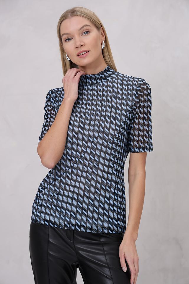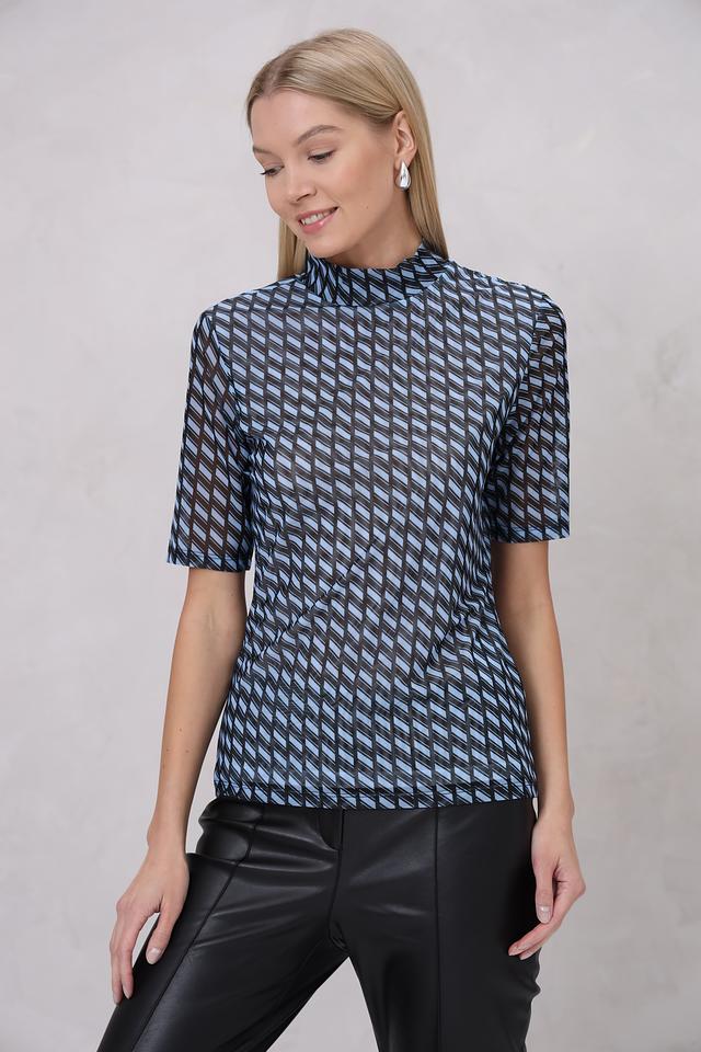 Блуза Marc Aurel голубого цвета с оригинальным геометрическим принтом станет стильным дополнением вашего гардероба. Модель выполнена из полупрозрачной ткани с короткими рукавами и высоким воротником-стойкой. Состав: полиэстер 95%, эластан 5%