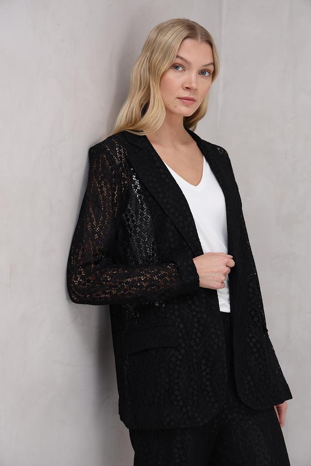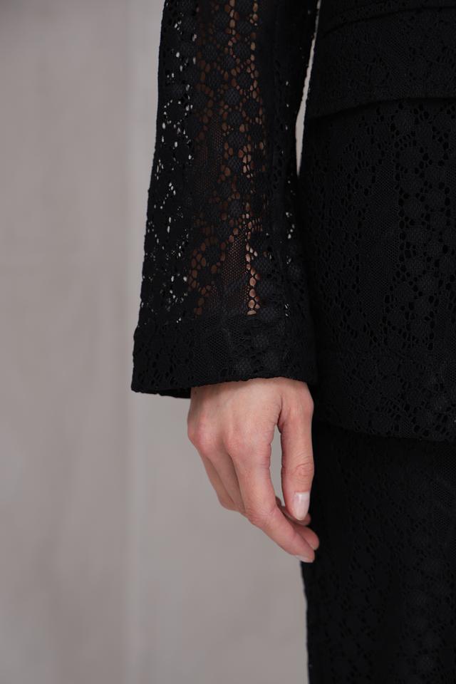 Жакет имеет классический силуэт с лацканами, длинными рукавами и застёжкой на пуговицы. Особенностью модели является кружевное оформление, придающее ей элегантность и женственность.