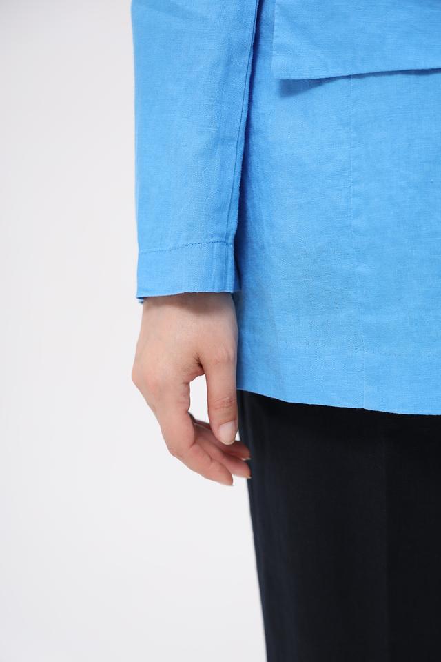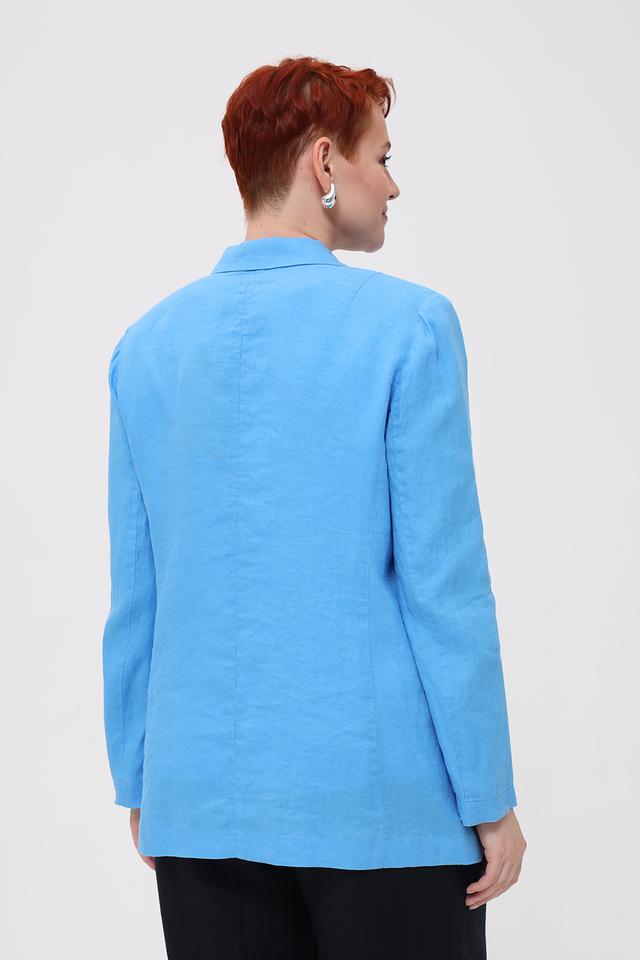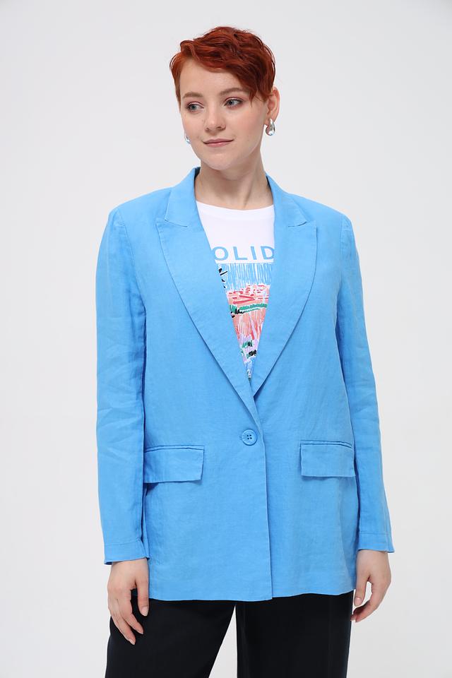 Модель отличается прямым силуэтом, который подходит для различных типов фигур. Длинные рукава и боковые карманы добавляют функциональности. Нежный голубой цвет делает этот жакет универсальным дополнением к любому образу.