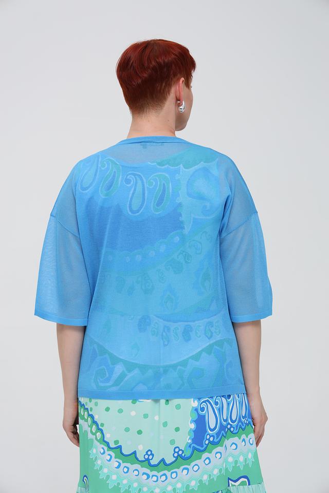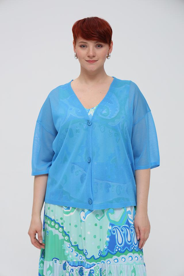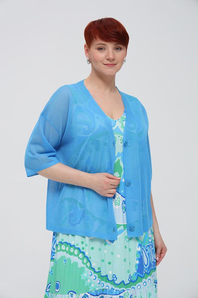 Жакет имеет свободный крой, V-образный вырез и короткие рукава. Застежка выполнена на пуговицы в тон изделию. Сочетание вискозы и полиэстера в составе обеспечивает приятные тактильные ощущения и практичность в уходе.