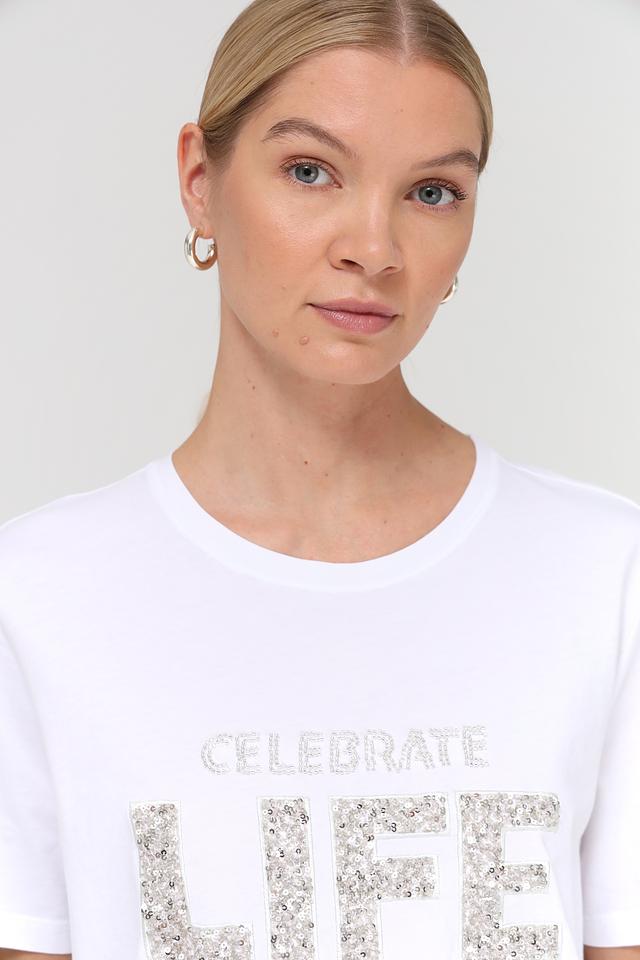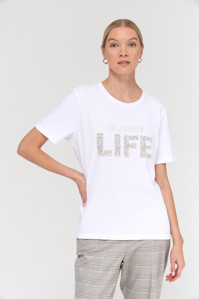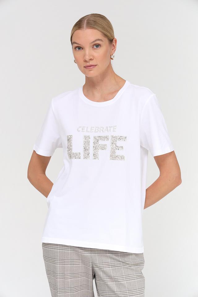Особенностью данной модели является стильный принт "Celebrate Life", выполненный в серебристых тонах, который добавляет образу оригинальности и позитива. Футболка имеет прямой крой и короткие рукава, что делает ее универсальной для различных типов фигур.