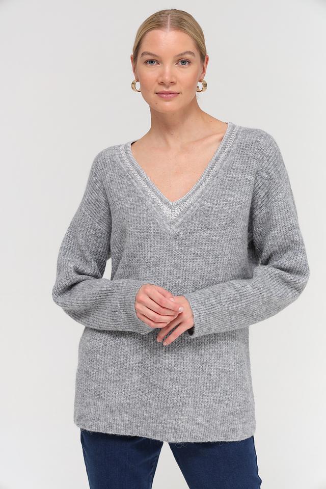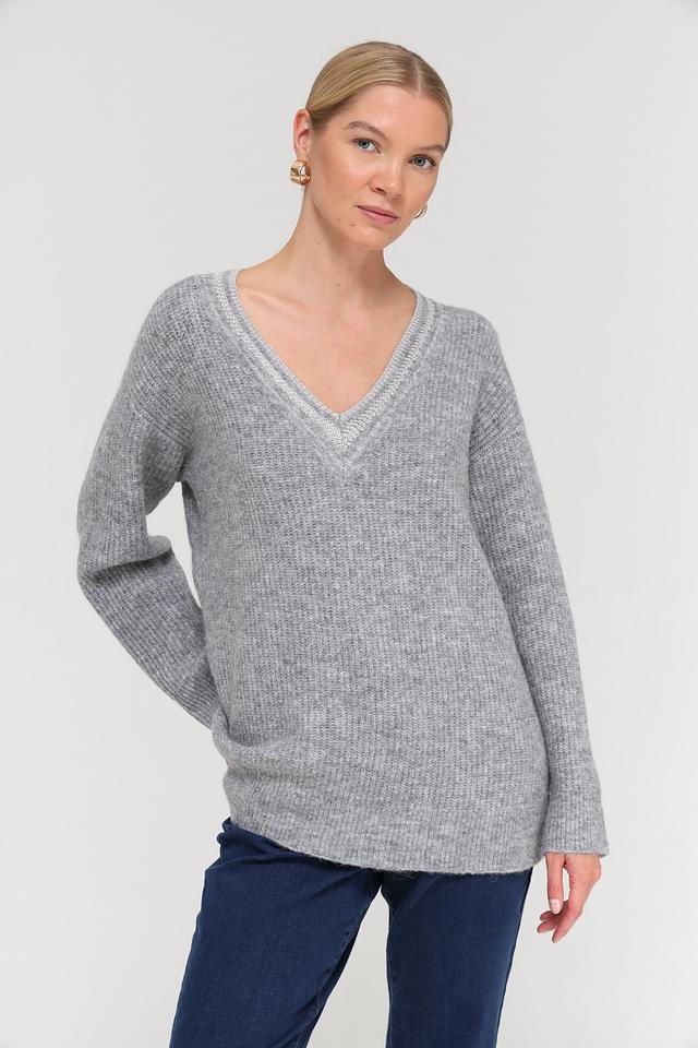 Пуловер имеет V-образный вырез, который визуально удлиняет шею и придает образу элегантность. Свободный крой обеспечивает комфорт и свободу движений, а длинные рукава защищают от прохлады.
