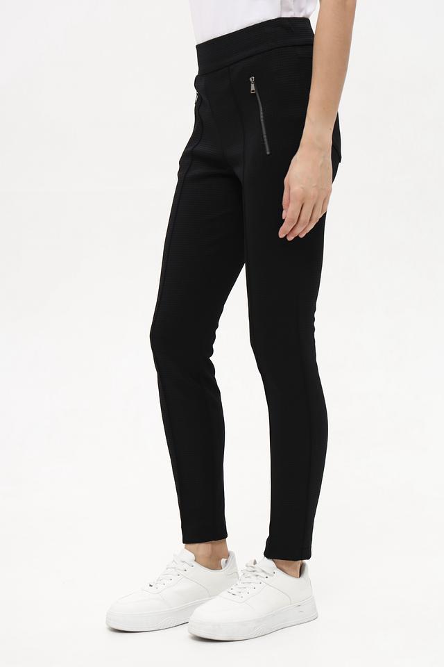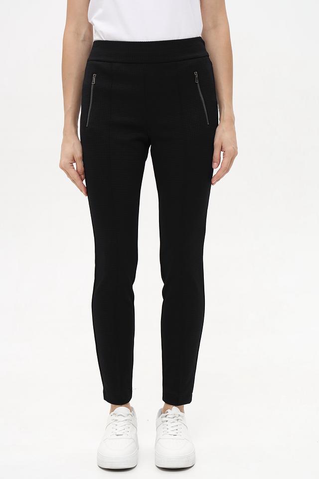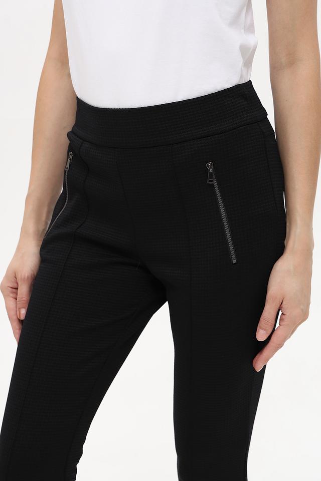 Модель имеет прямую посадку и стандартную длину. На поясе предусмотрена эластичная резинка с регулирующим шнурком, обеспечивающая надежную фиксацию и комфортную посадку по фигуре. Боковые карманы на молнии добавляют функциональности и стиля.