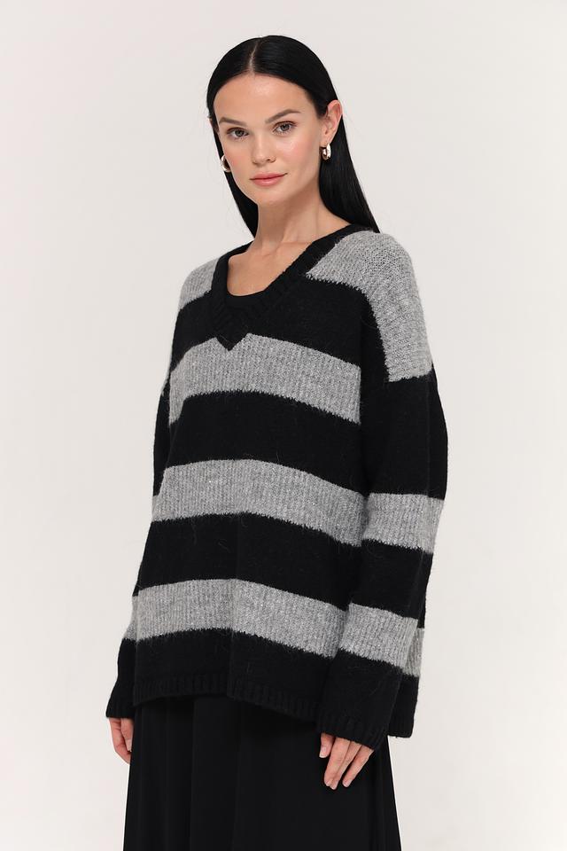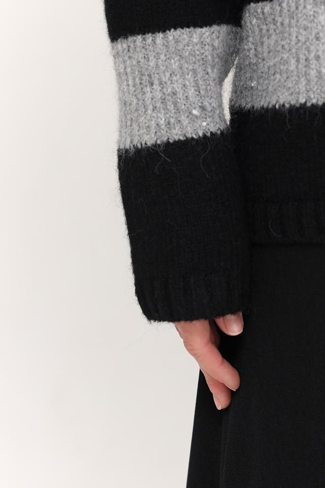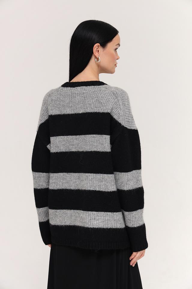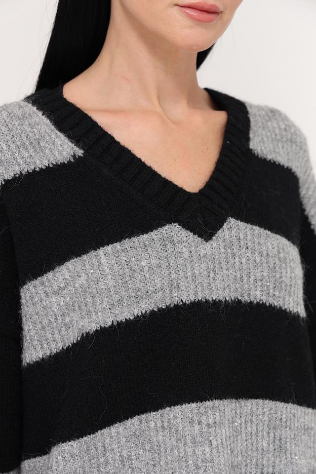 Основной цвет пуловера – чёрный, дополненный широкими горизонтальными полосами серого цвета. Такое сочетание делает его универсальным и легко сочетаемым с различными элементами одежды.