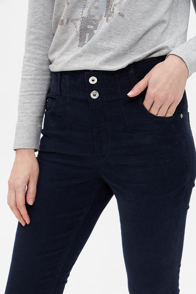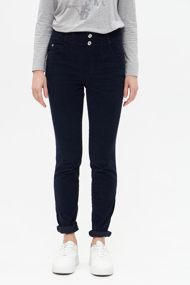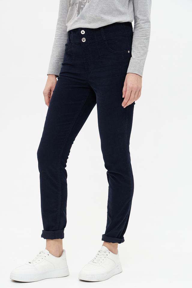 Темно-синие брюки от Marc Aurel из хлопка с эластаном. Модель с завышенной талией и укороченным силуэтом, застегиваются на пуговицы. Состав: хлопок 98%, эластан 2%