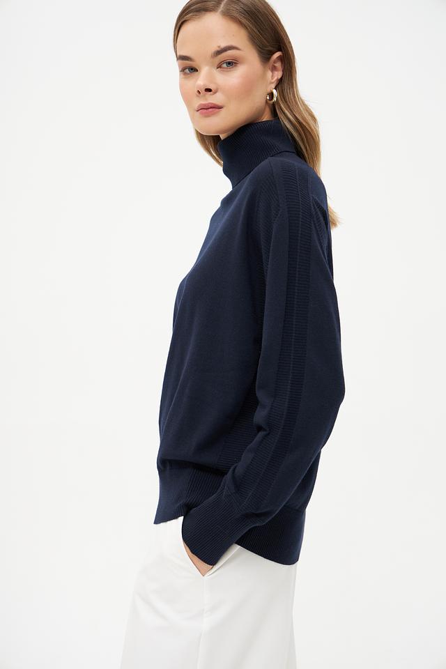 Тёмно-синий цвет делает эту водолазку универсальным элементом гардероба, который легко сочетается с другими вещами. Она идеально подходит для создания как повседневных, так и более формальных образов. Водолазку можно носить самостоятельно или в качестве базового слоя под пиджак или пальто.