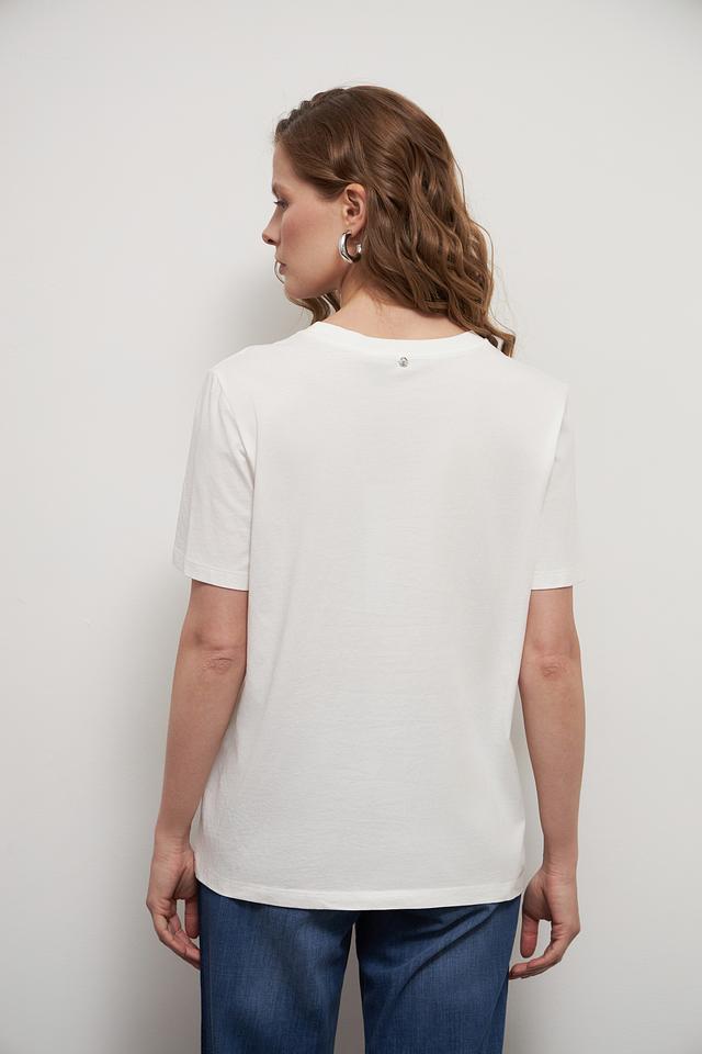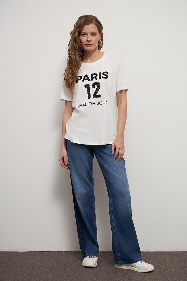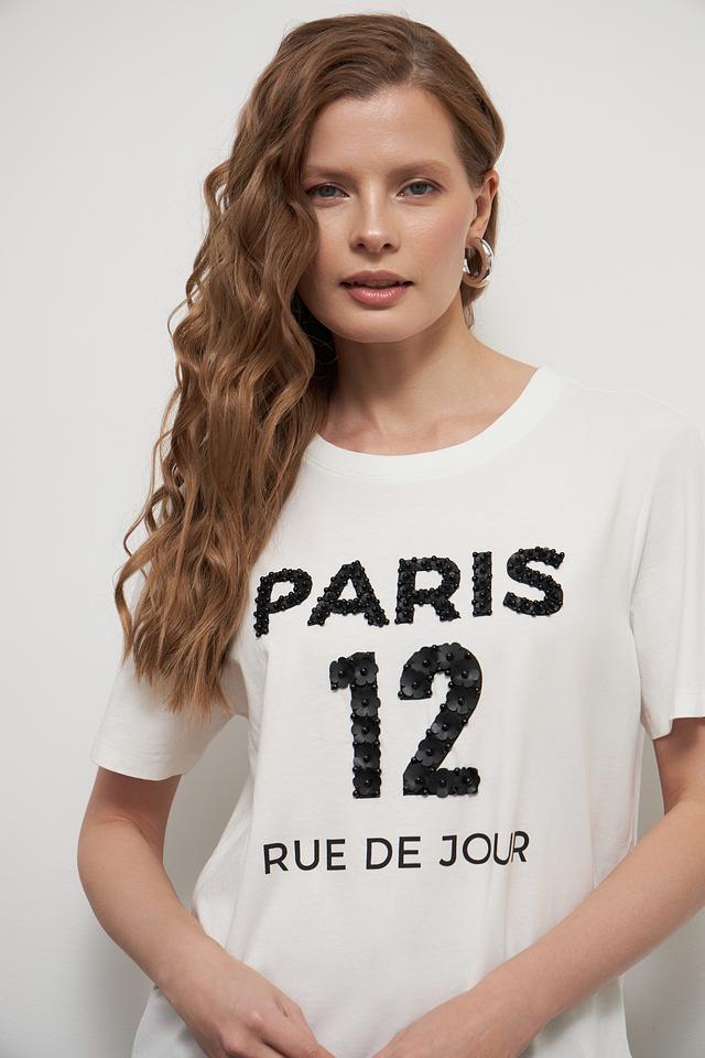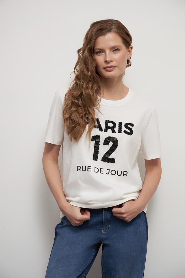 Особенностью данной модели является стильный чёрный принт "Paris 12 Rue de Jour", который добавляет образу изысканности и индивидуальности. Футболка имеет прямой крой и короткие рукава, что делает её идеальной для тёплой погоды.