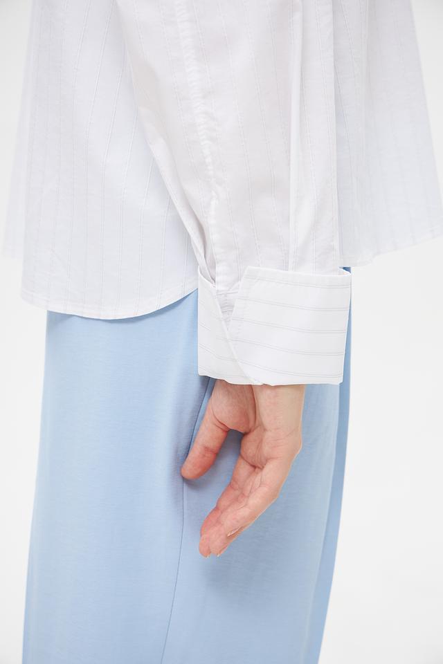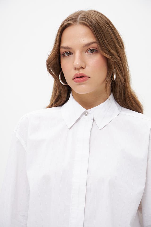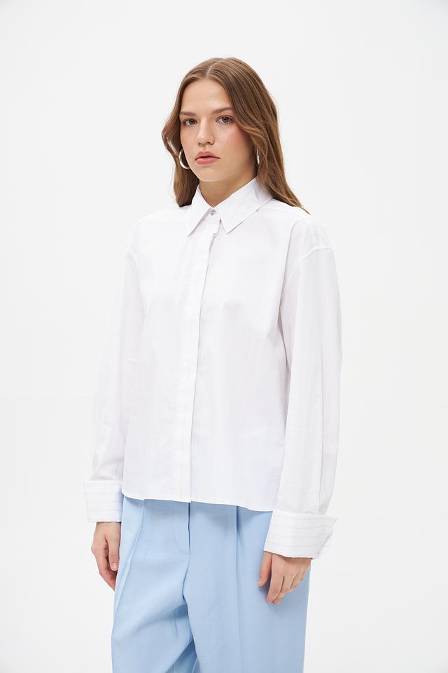 Модель выполнена в свободном оверсайз крое, обеспечивающем комфорт и свободу движений. Классический воротник и длинные рукава с манжетами на пуговицах придают блузке элегантный вид.