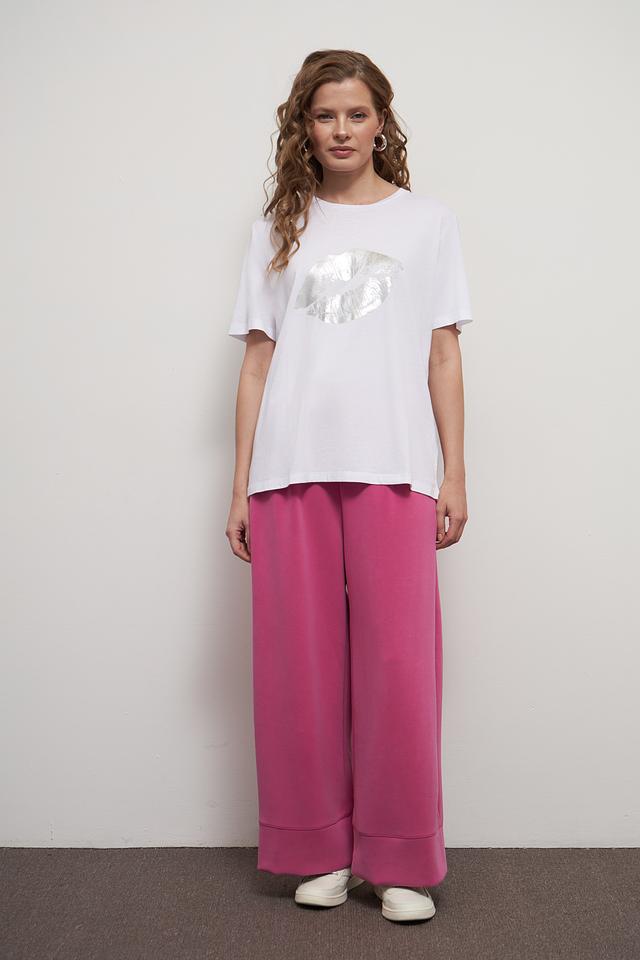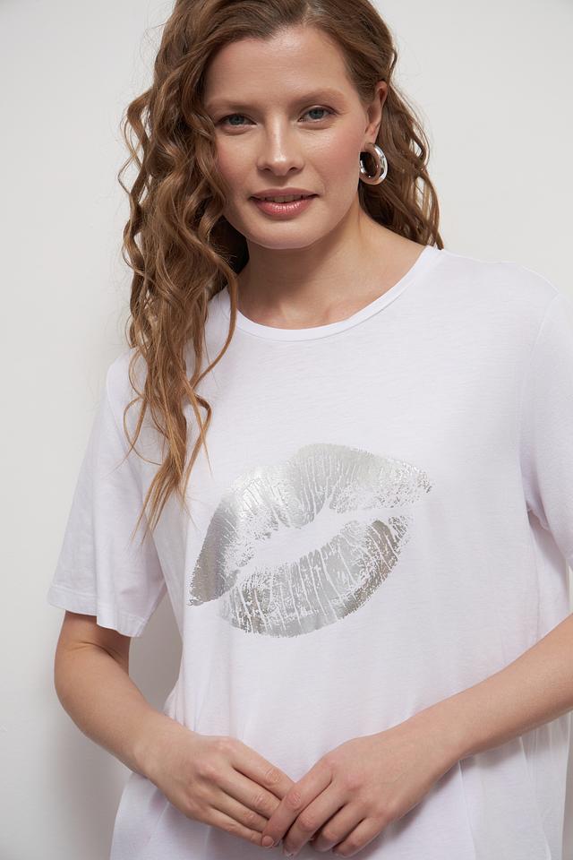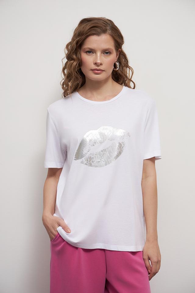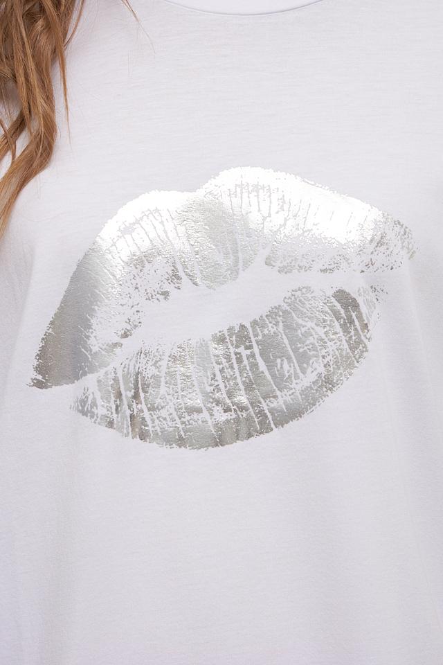 Основным акцентом футболки является яркий принт в виде женских губ, выполненный в серебристых тонах. Этот элемент дизайна придает образу игривость и индивидуальность.