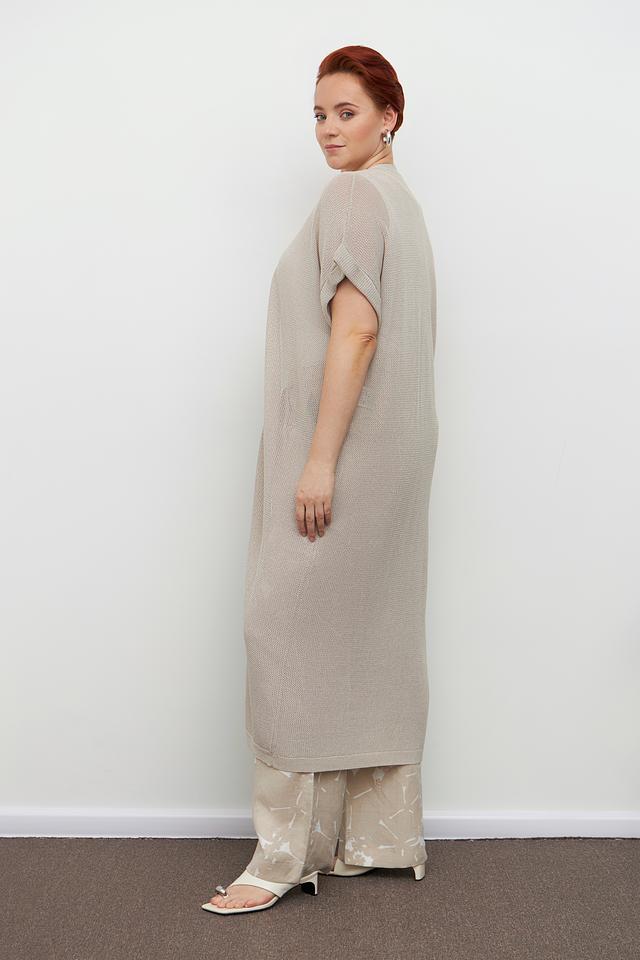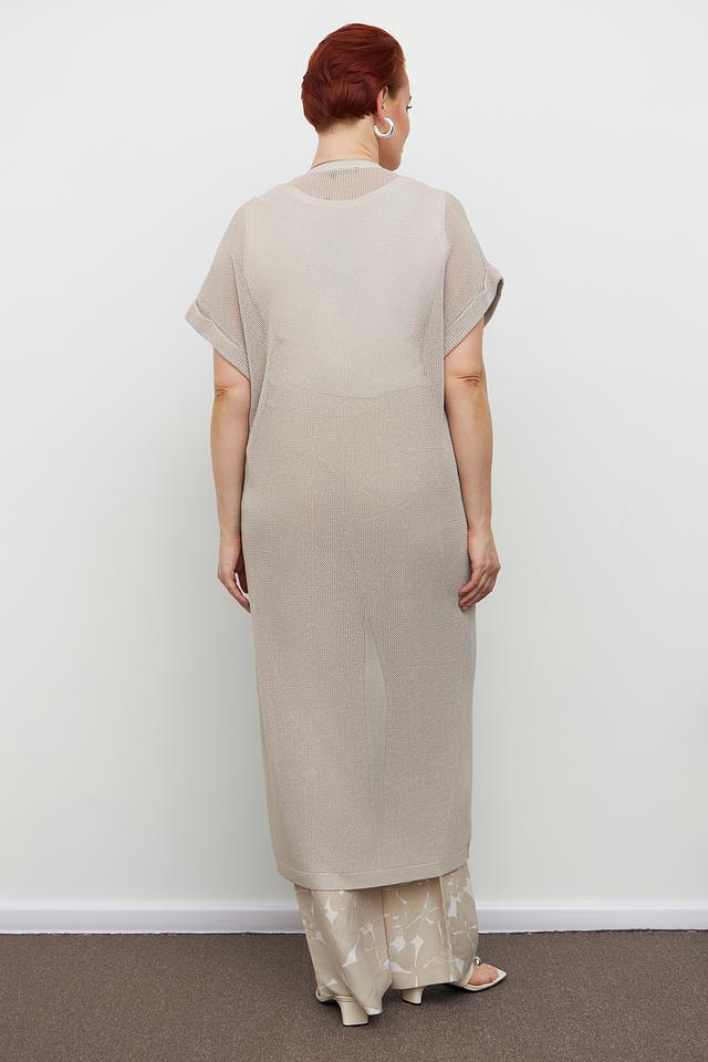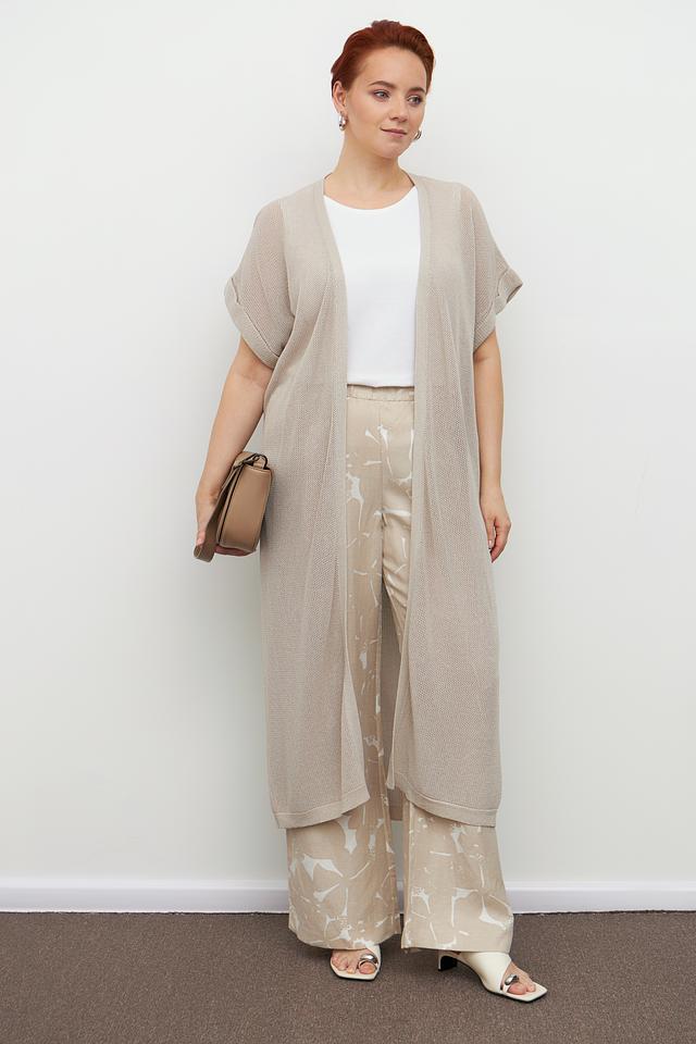 Жакет имеет свободный крой, короткие рукава и открытый фасон, что позволяет носить его поверх другой одежды. Отсутствие застежек делает его легким и удобным в использовании. Текстура вязки придает изделию особый шарм и элегантность.