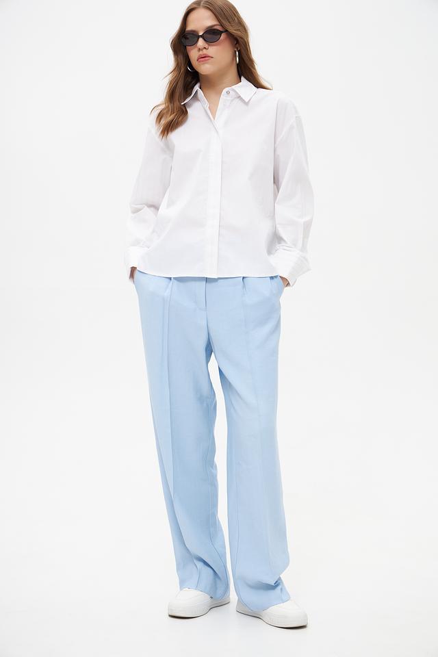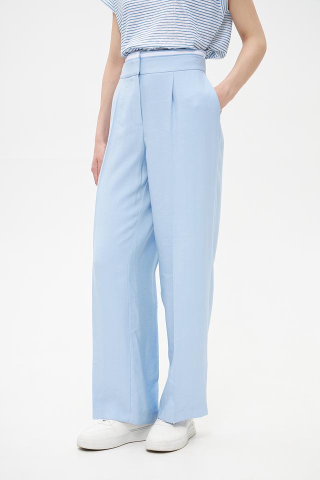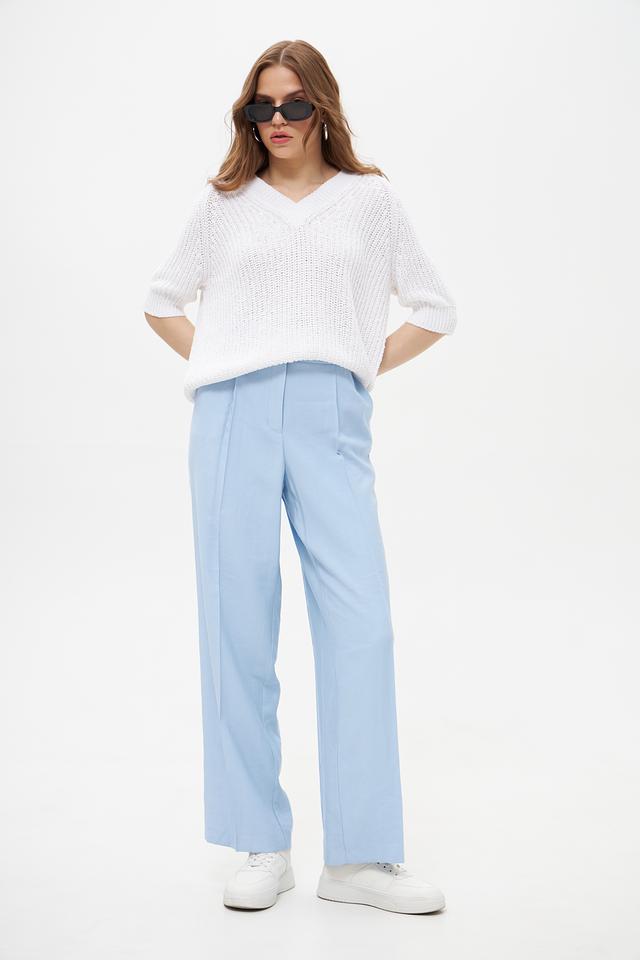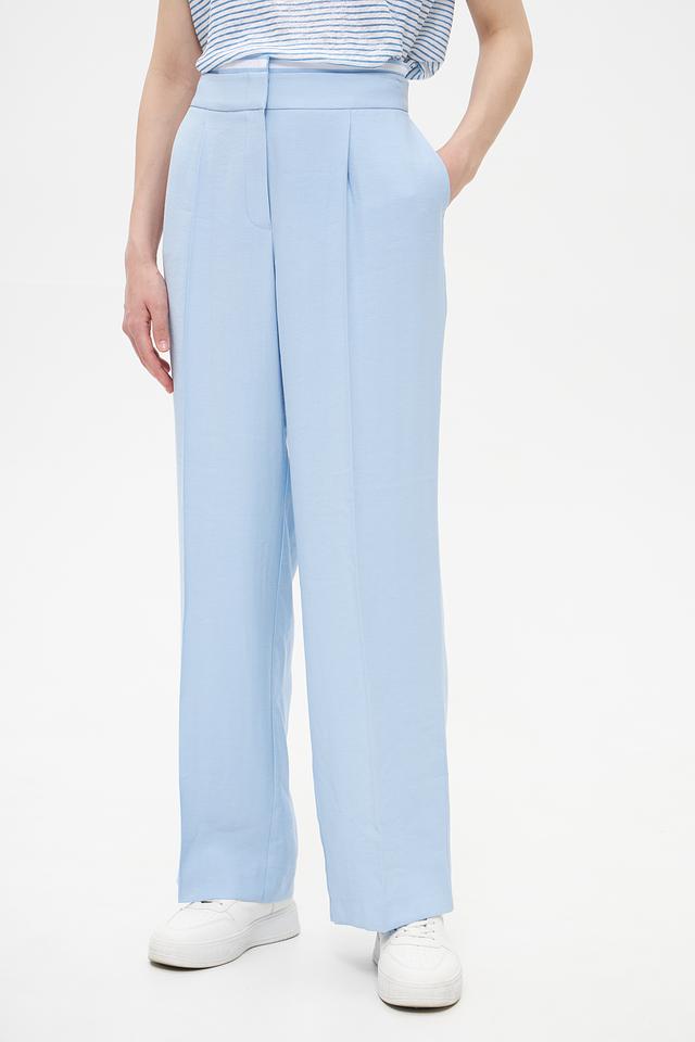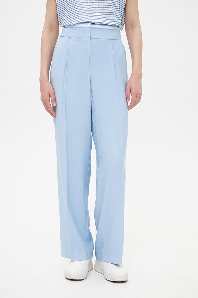 Брюки имеют высокую посадку и пояс со шлевками для ремня, что позволяет подчеркнуть талию и создать элегантный силуэт. На брюках предусмотрены аккуратные складки, добавляющие модели классический вид.