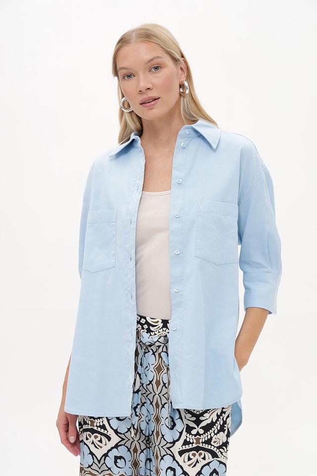 Классический воротник и застёжка на пуговицы придают блузе элегантный вид. Она прекрасно сочетается с брюками, джинсами или юбками, позволяя создавать разнообразные образы. Голубой цвет освежает и добавляет образу лёгкости.