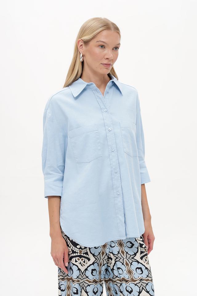Голубая блуза Marc Aurel из льна, хлопка и эластана. Обладает свободным кроем, рукавами 3/4 и накладными карманами. Идеальный выбор для создания лёгкого и стильного образа. Состав: лен 53%, хлопок 44%, эластан 3%
