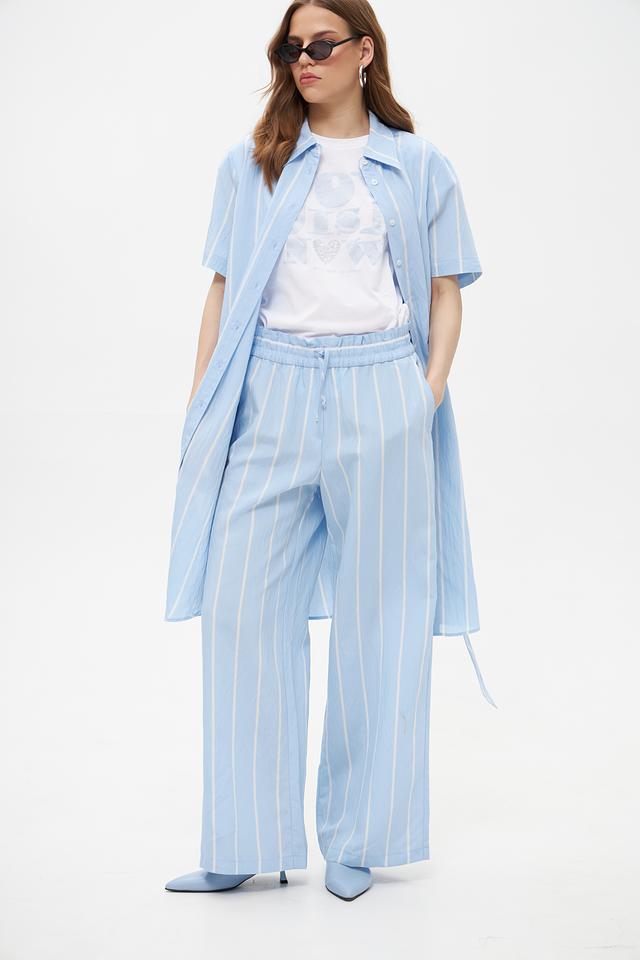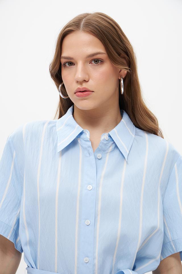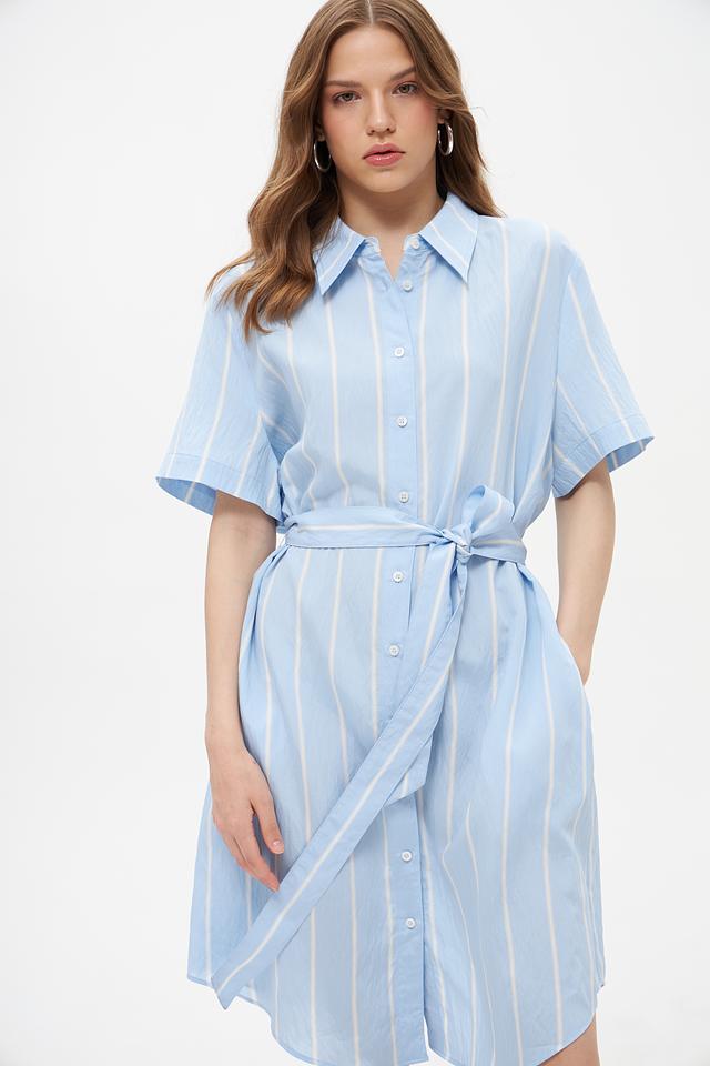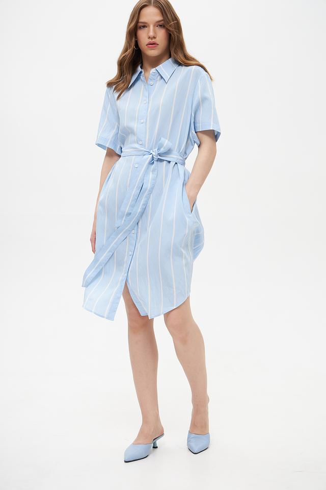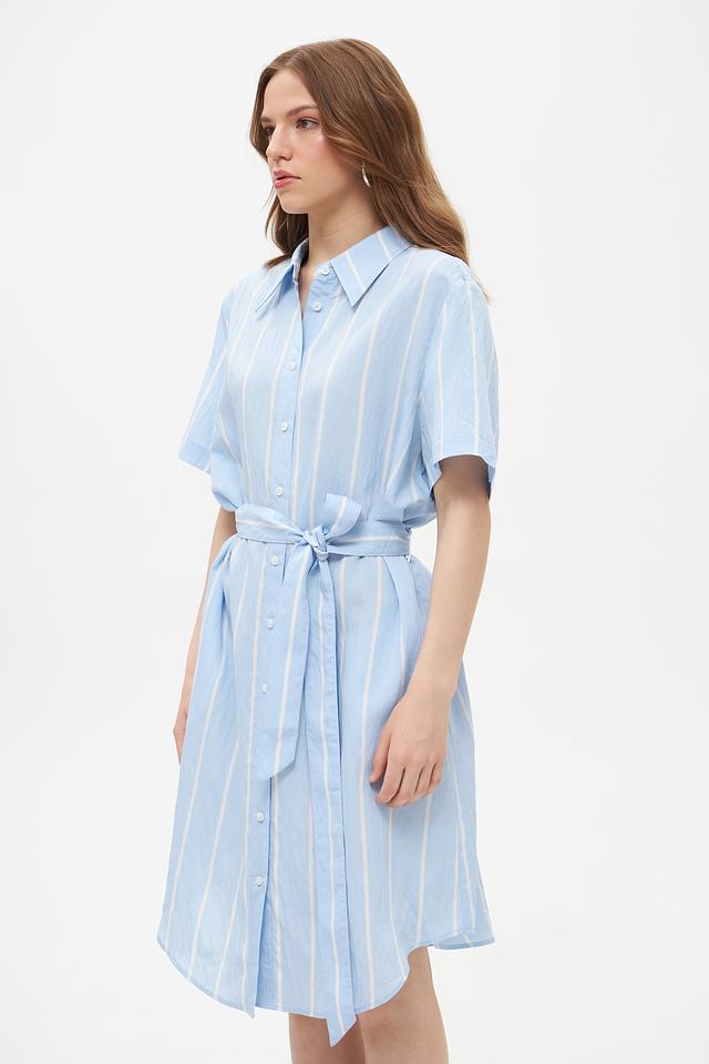 Модель выполнена в светло-голубом цвете с вертикальной полоской, что визуально вытягивает силуэт. Платье имеет прямой крой и длину до колена.