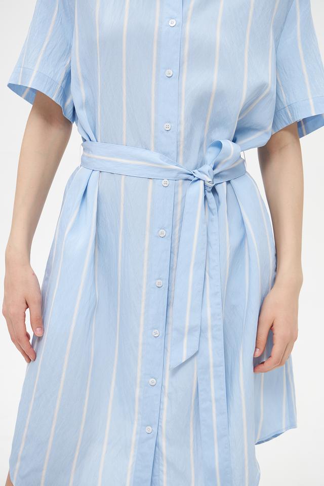 Голубое платье-рубашка от Marc Aurel в вертикальную полоску. Изготовлено из вискозы с добавлением полиамида, что обеспечивает комфорт и приятные тактильные ощущения. Подчеркните талию с помощью притачного пояса. Состав: вискоза 83%, полиамид 17%