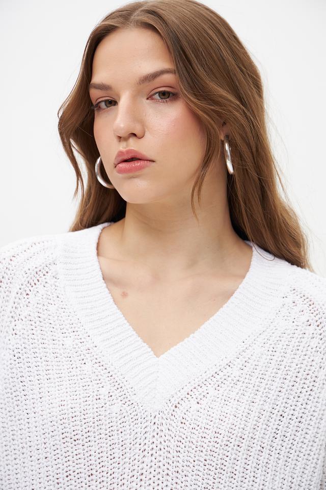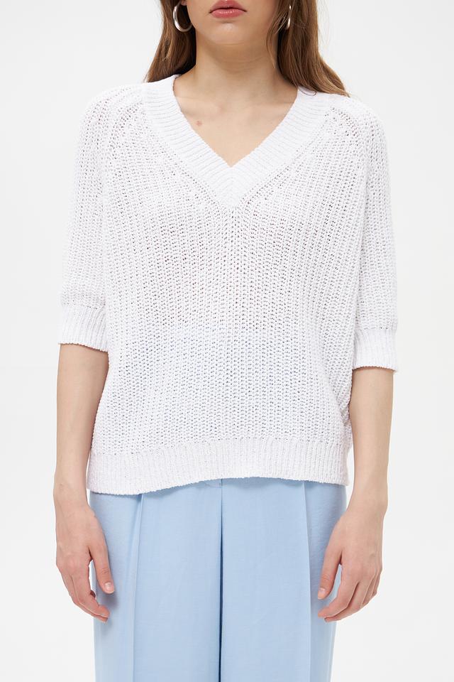 Пуловер отличается лёгкой, воздушной текстурой благодаря особому плетению. Короткие рукава делают его идеальным выбором для тёплой погоды или для создания многослойных образов. Белый цвет пуловера легко сочетается с любой одеждой и аксессуарами.