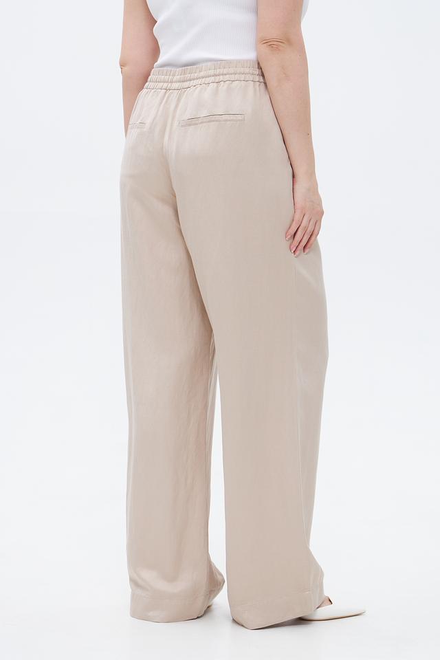 Брюки имеют завышенную талию и широкий крой, который визуально удлиняет ноги и придает силуэту изящество. Эластичный пояс с кулиской обеспечивает комфортную посадку и позволяет регулировать обхват талии.