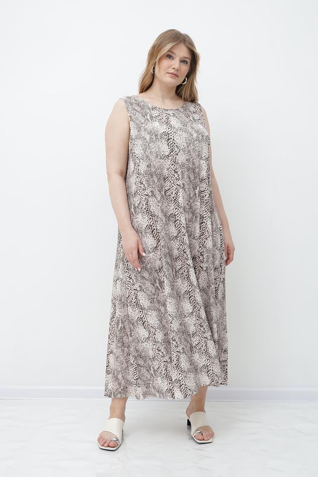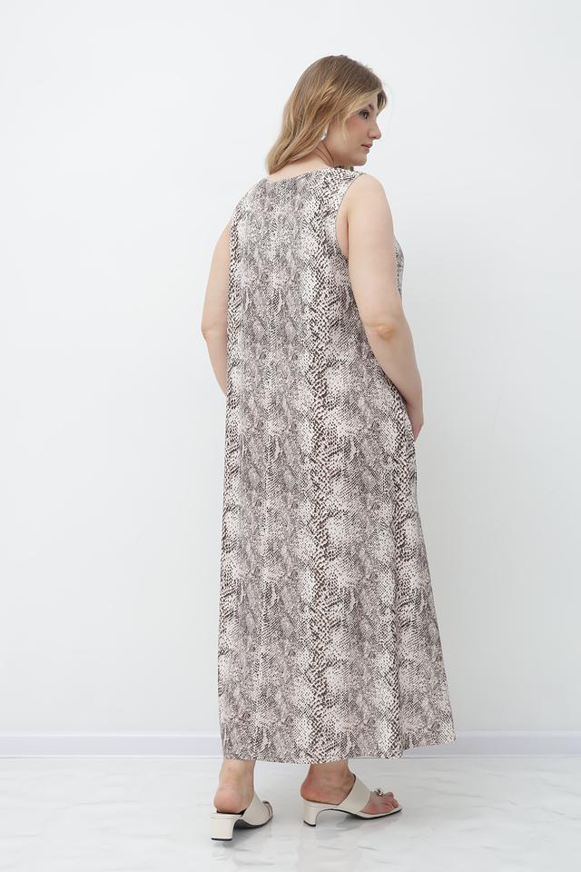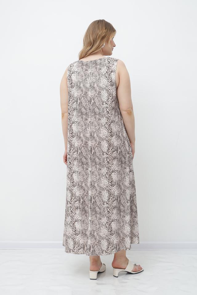 Модель имеет прямой, слегка расклешенный силуэт, который обеспечивает свободу движений и комфорт в носке. Платье без рукавов с округлым вырезом горловины. Длина платья – миди.