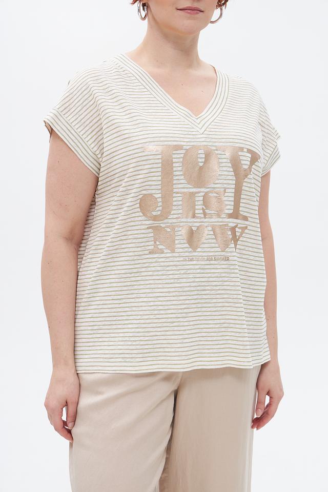 Передняя часть футболки украшена крупной золотистой надписью, добавляющей образу изысканности и стиля. V-образный вырез горловины и укороченные рукава делают силуэт более легким и женственным.