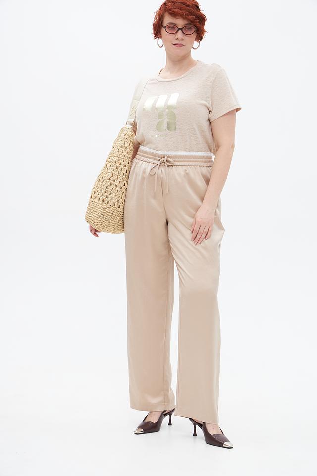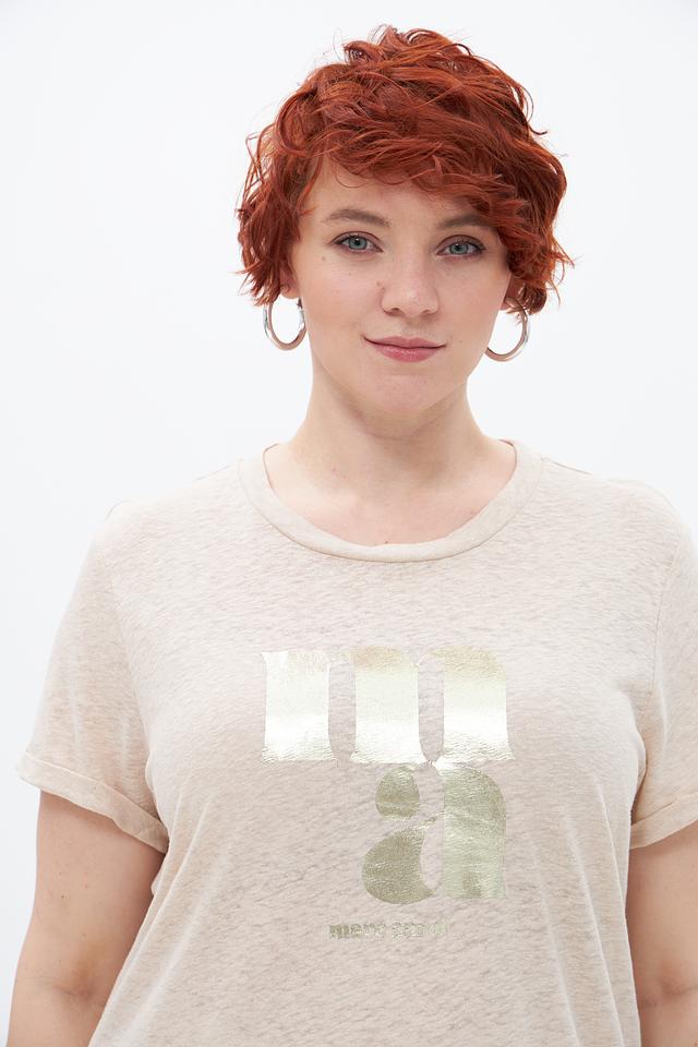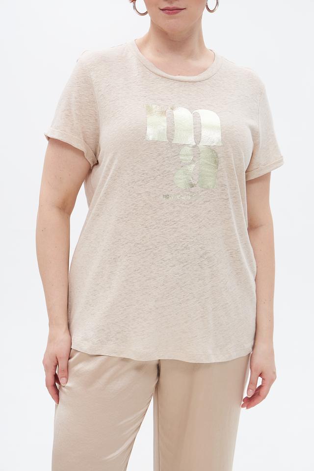 Бежевая футболка Marc Aurel свободного кроя с оригинальным принтом. Изготовлена из натурального льна с добавлением хлопка, обеспечивающего комфорт и воздухопроницаемость. Состав: лен 70%, хлопок 30%